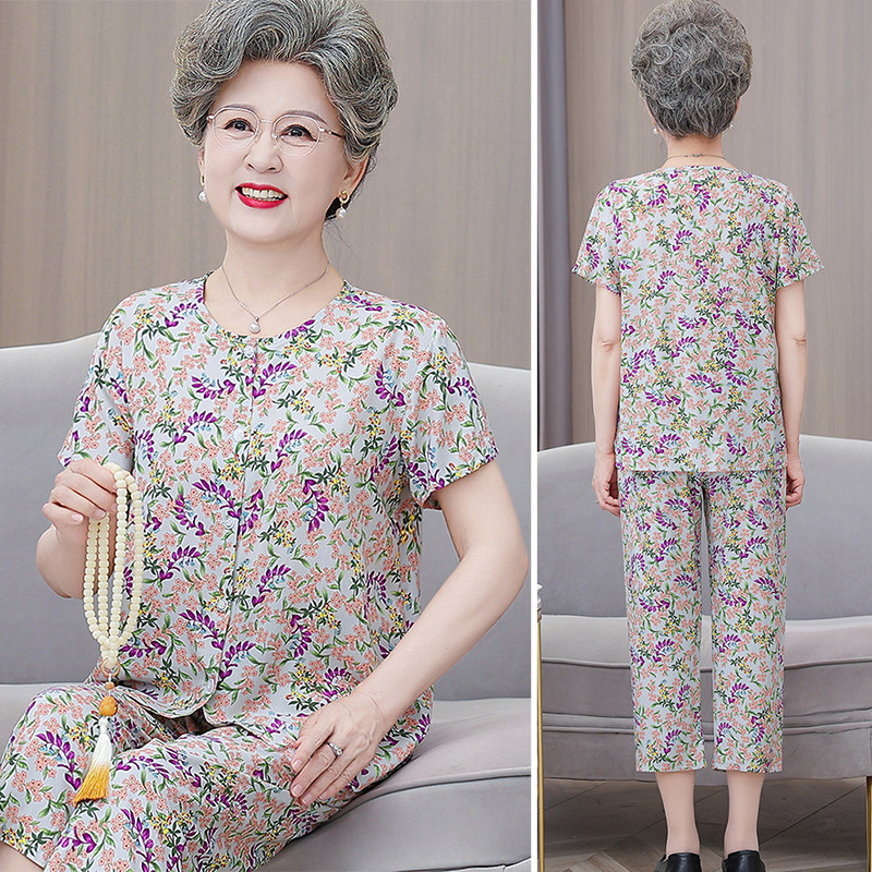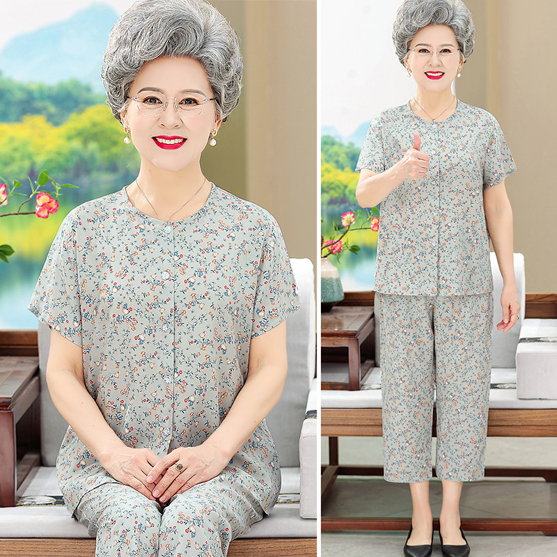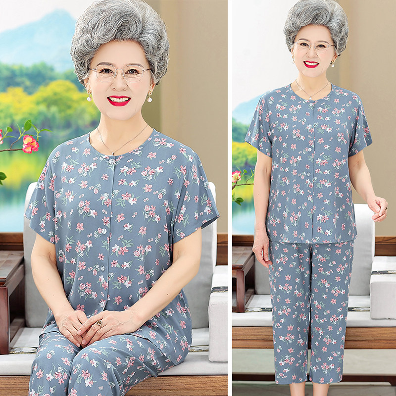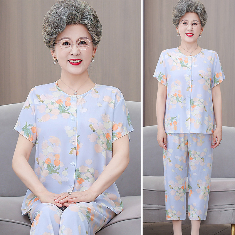 中老年开衫棉绸睡衣女夏季大码奶奶短袖套装妈妈人造棉家居服老人