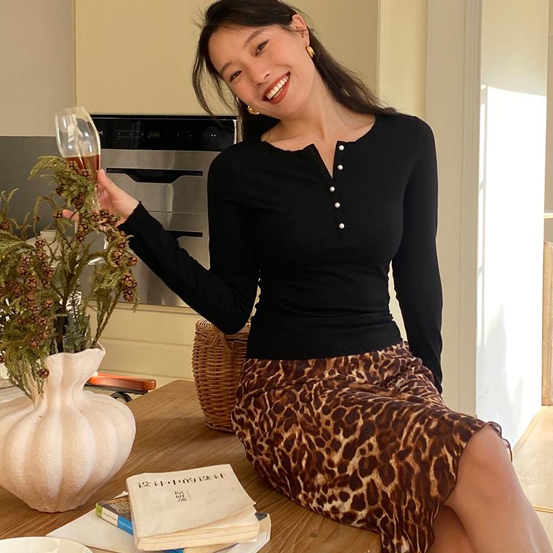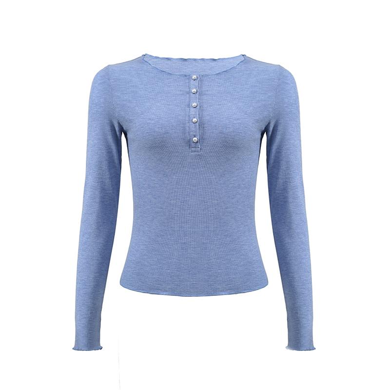 ooh itch痒痒 法式性感纯欲风珍珠t恤女长袖修身显瘦弹力紧身上衣