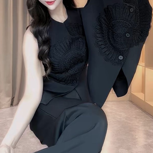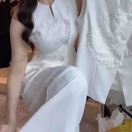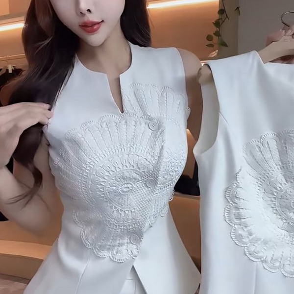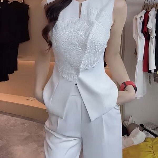 2025夏季新款重工刺绣蕾丝拼接收腰V领无袖上衣+高腰直筒裤两件套