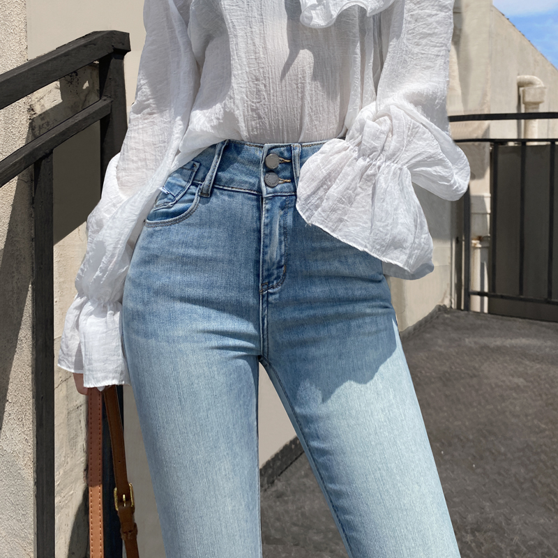 小众闭眼入~浅蓝色九分牛仔裤女秋双排扣高腰紧身显瘦小脚铅笔裤