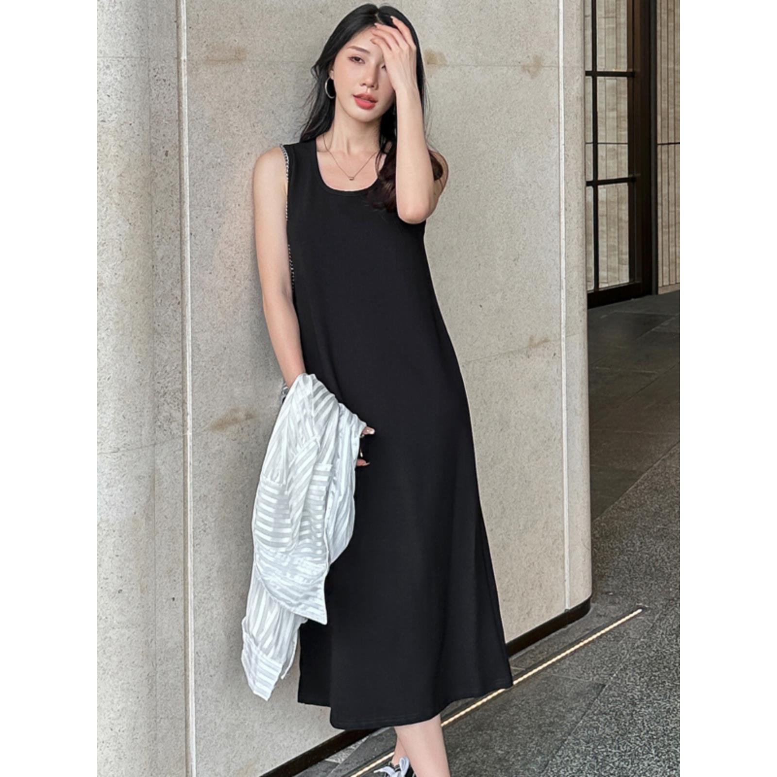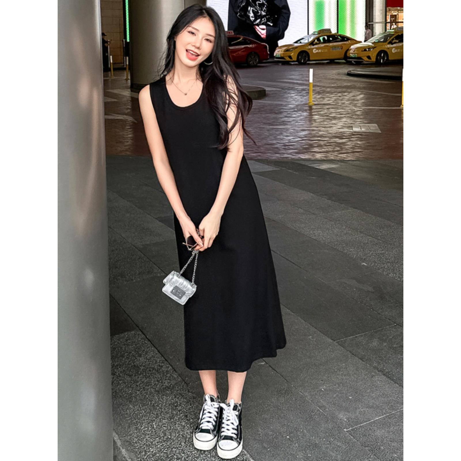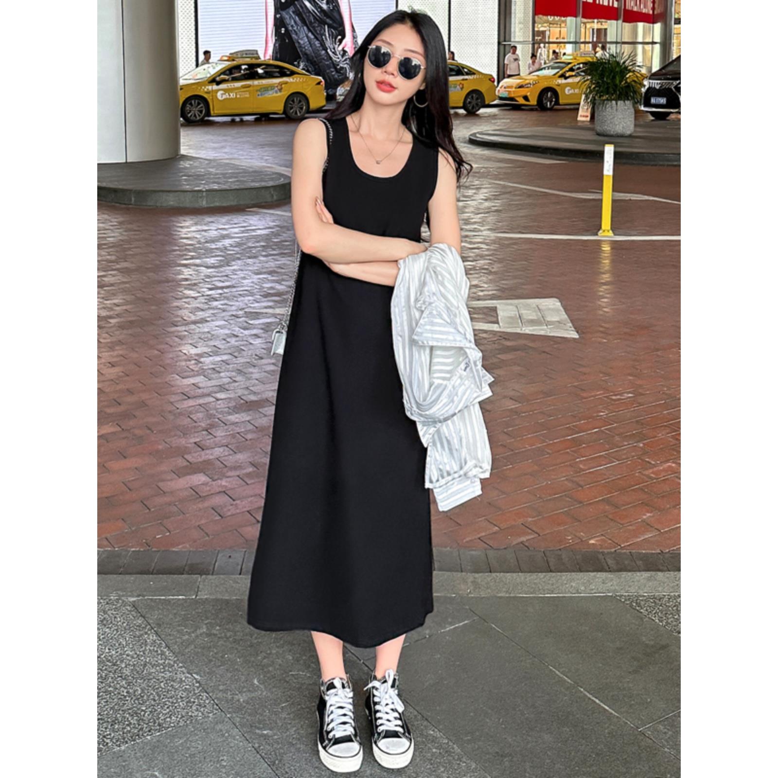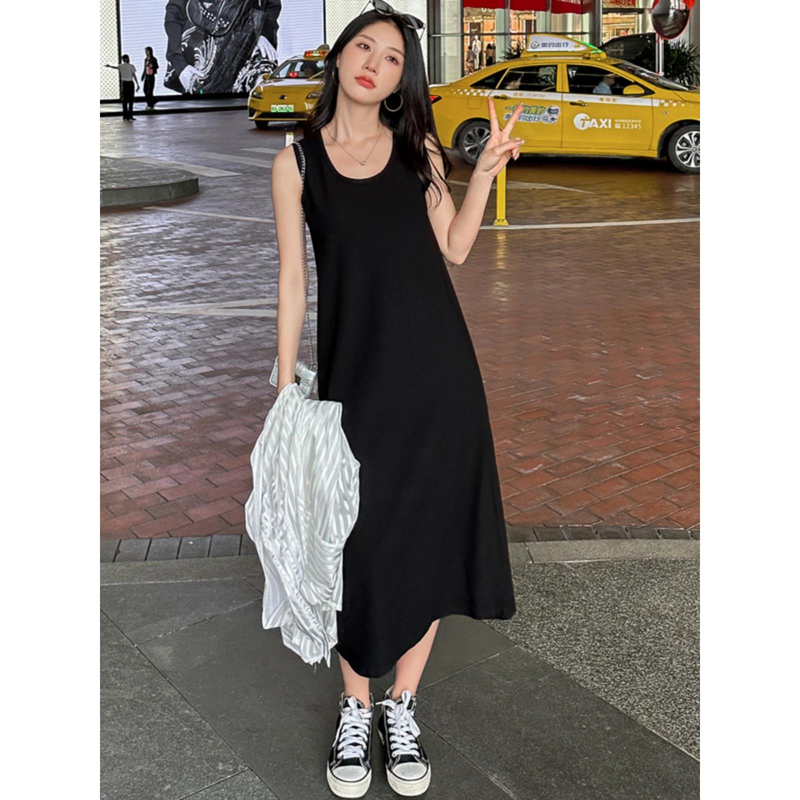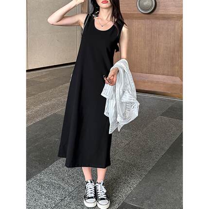 黑色吊带连衣裙中长款无袖背心裙女夏宽松显瘦内搭裙子垂感小黑裙