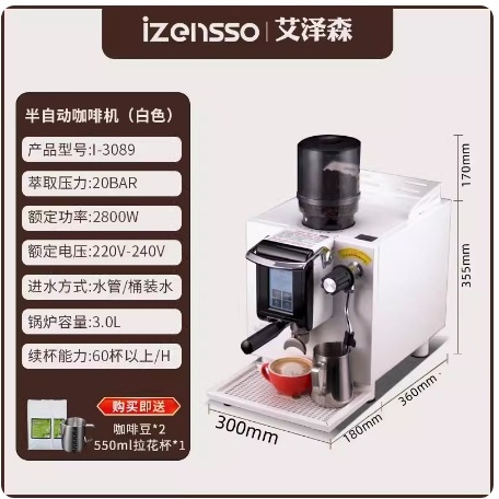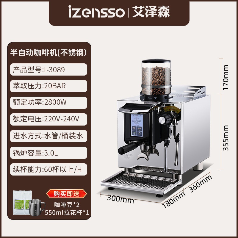 艾泽森3089咖啡机商用意式半自动小钢炮小型咖啡奶茶店研磨一体机