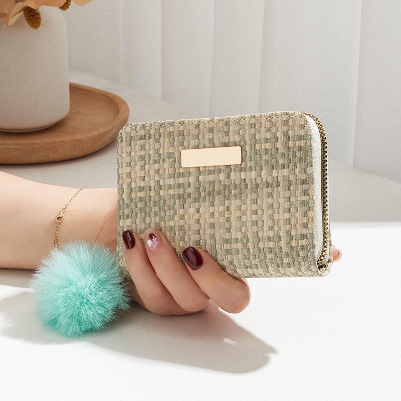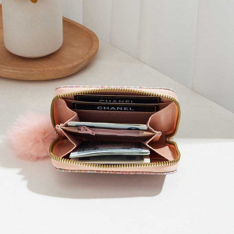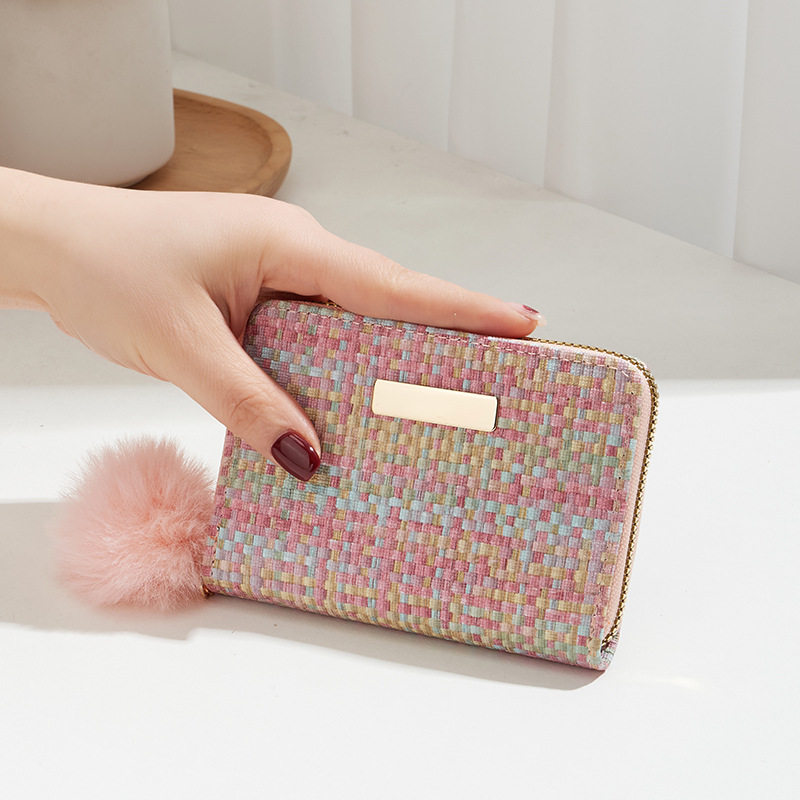 2024韩版新款单拉链幻彩短款女士钱包时尚毛球钱包手拿包一件