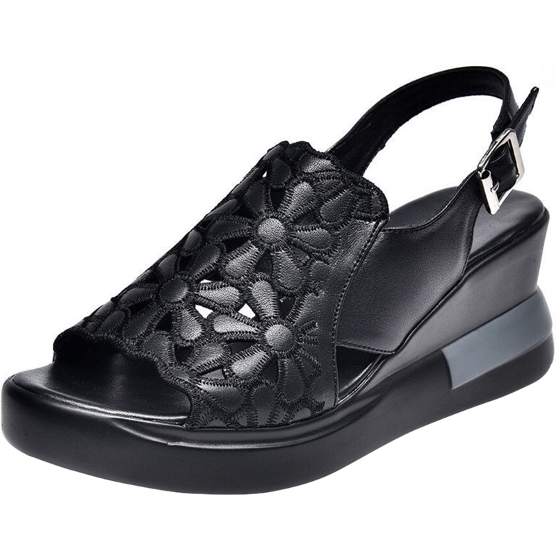 坡跟凉鞋女外穿真皮2025夏季新款百搭镂空绣花厚底软皮鱼嘴高跟鞋