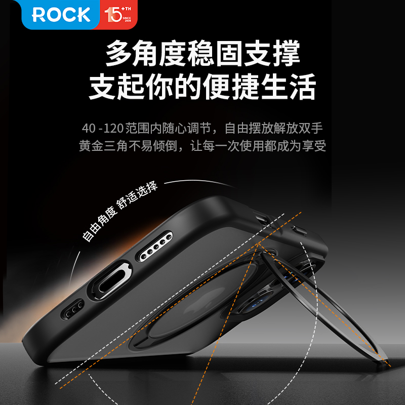 ROCK适用苹果16Promax磁吸旋转指环手机壳新款iPhone16Pro磨砂肤感16Plus支架保护套镜头防摔潮牌男女保护壳