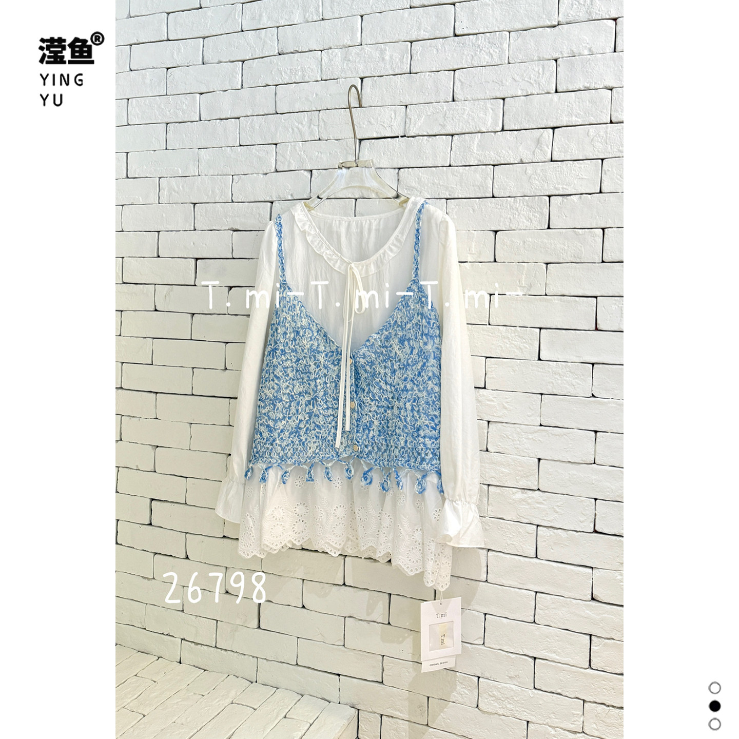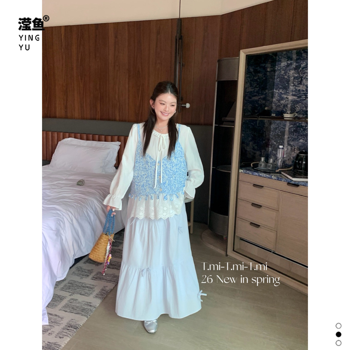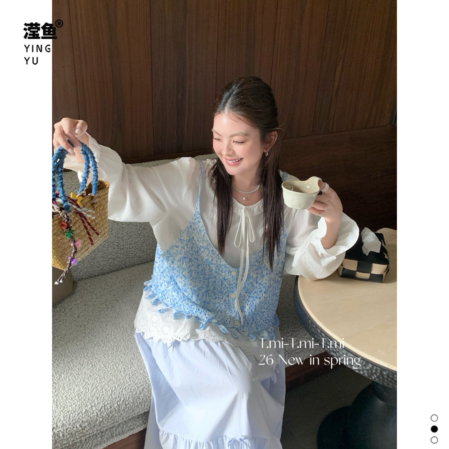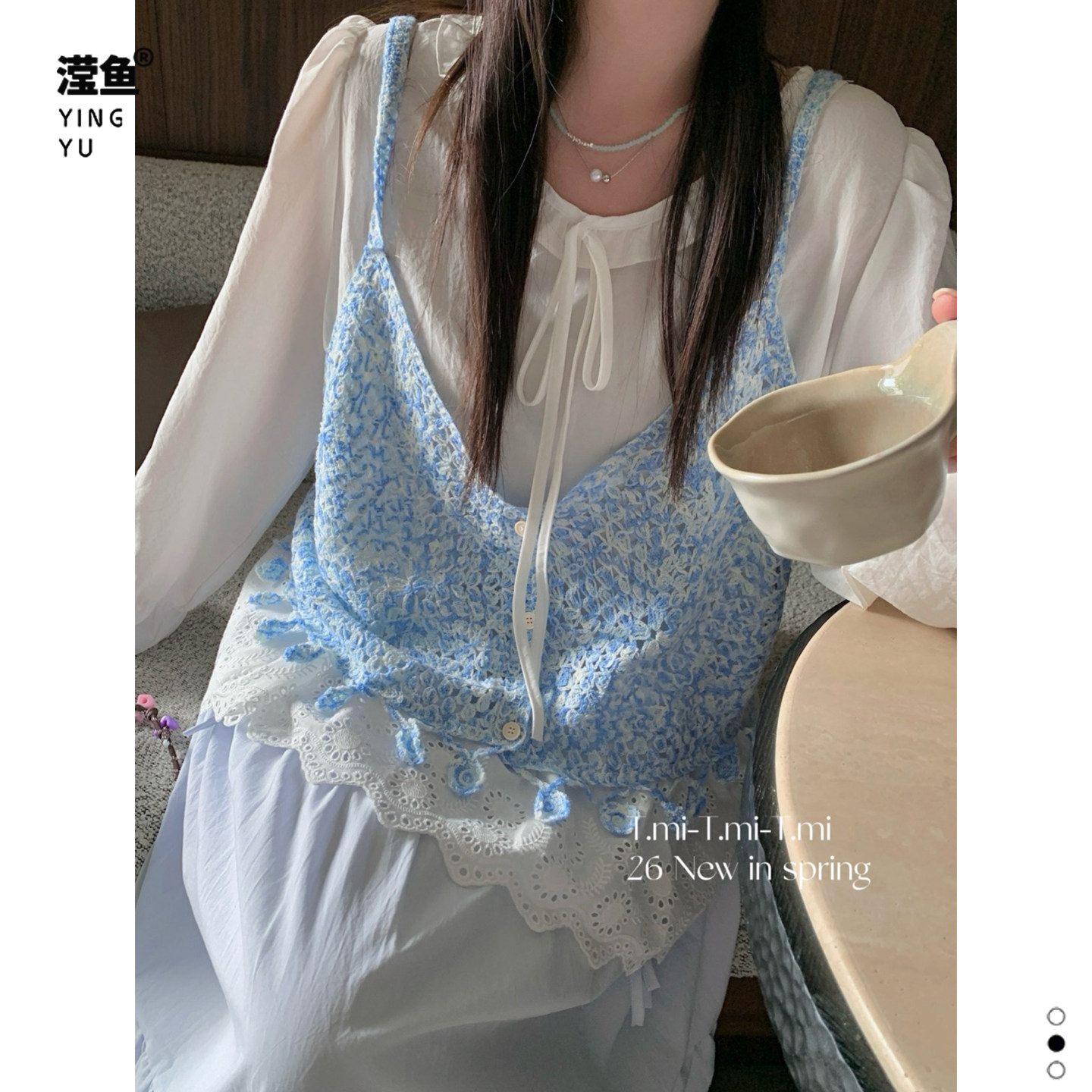 Tmi 26798大码甜美风蕾丝花边衬衫马甲蓝色叠穿百搭显瘦背心上衣