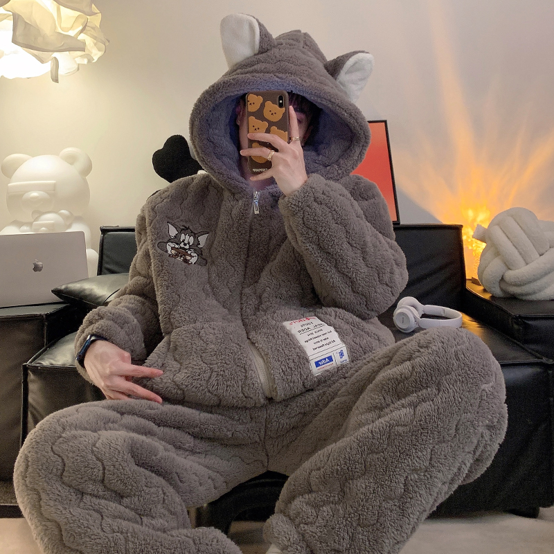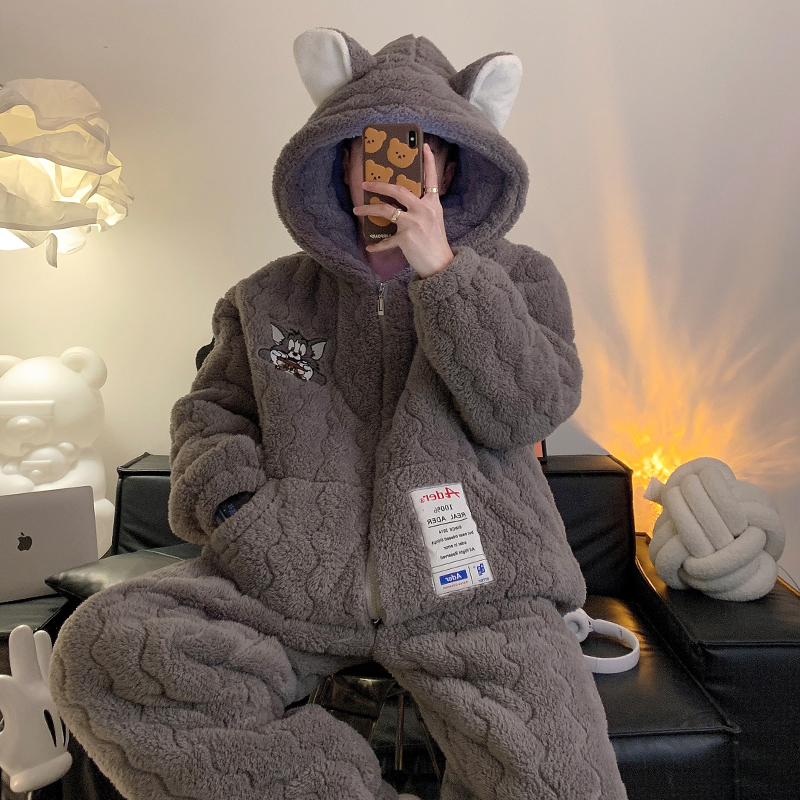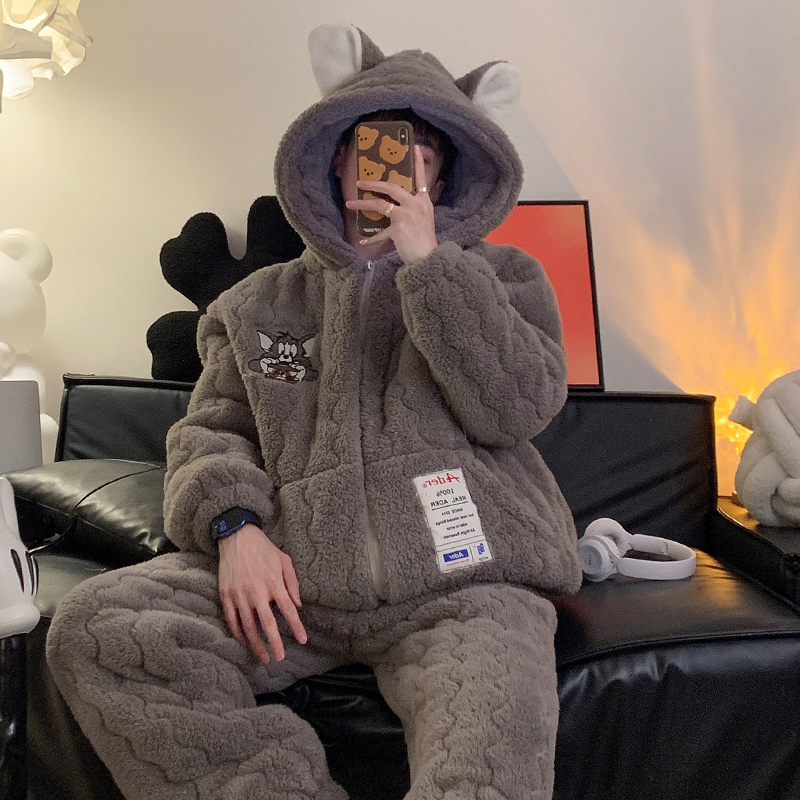 俞兆林男士睡衣秋冬季加绒加厚三层夹棉袄珊瑚绒青少年冬天家居服