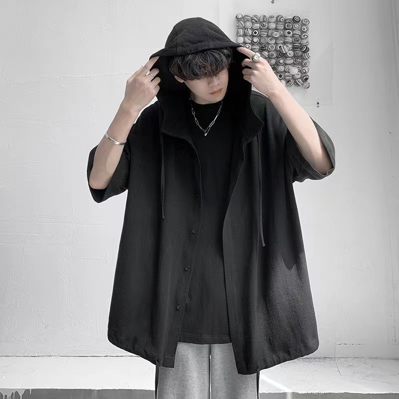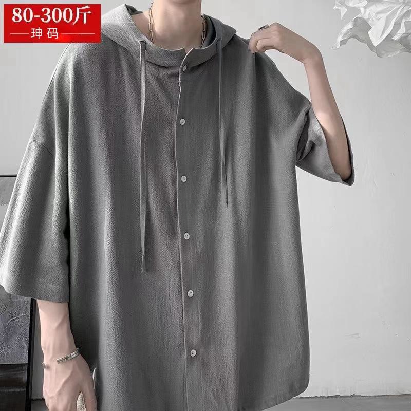大码慵懒风日系复古衬衫男女短袖连帽衫夏季薄款300斤痞帅ins衬衣
