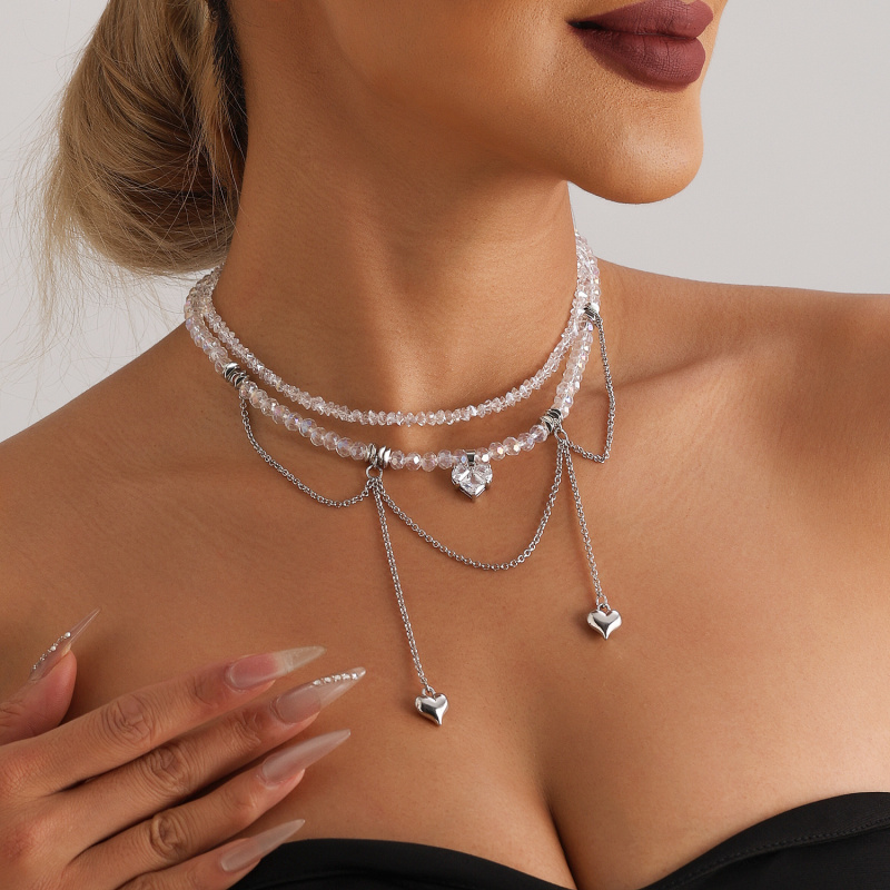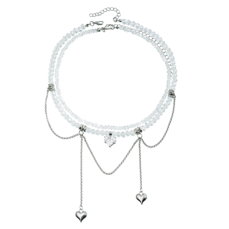欧美饰品爱心锆石双链流苏设计锁骨链ins轻奢高级感水晶项链首饰
