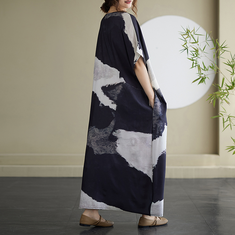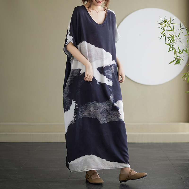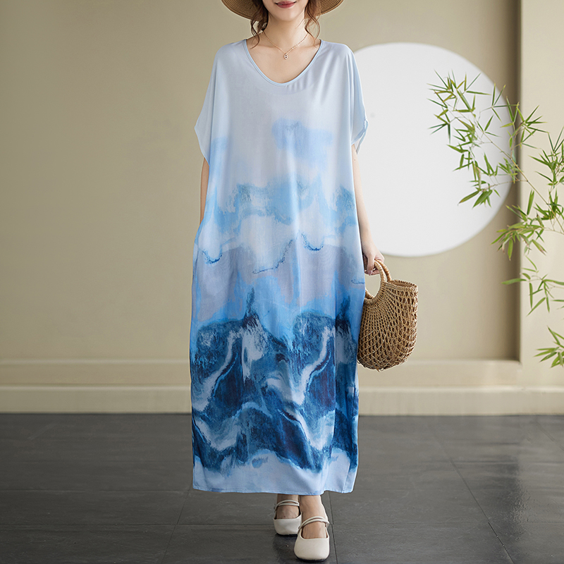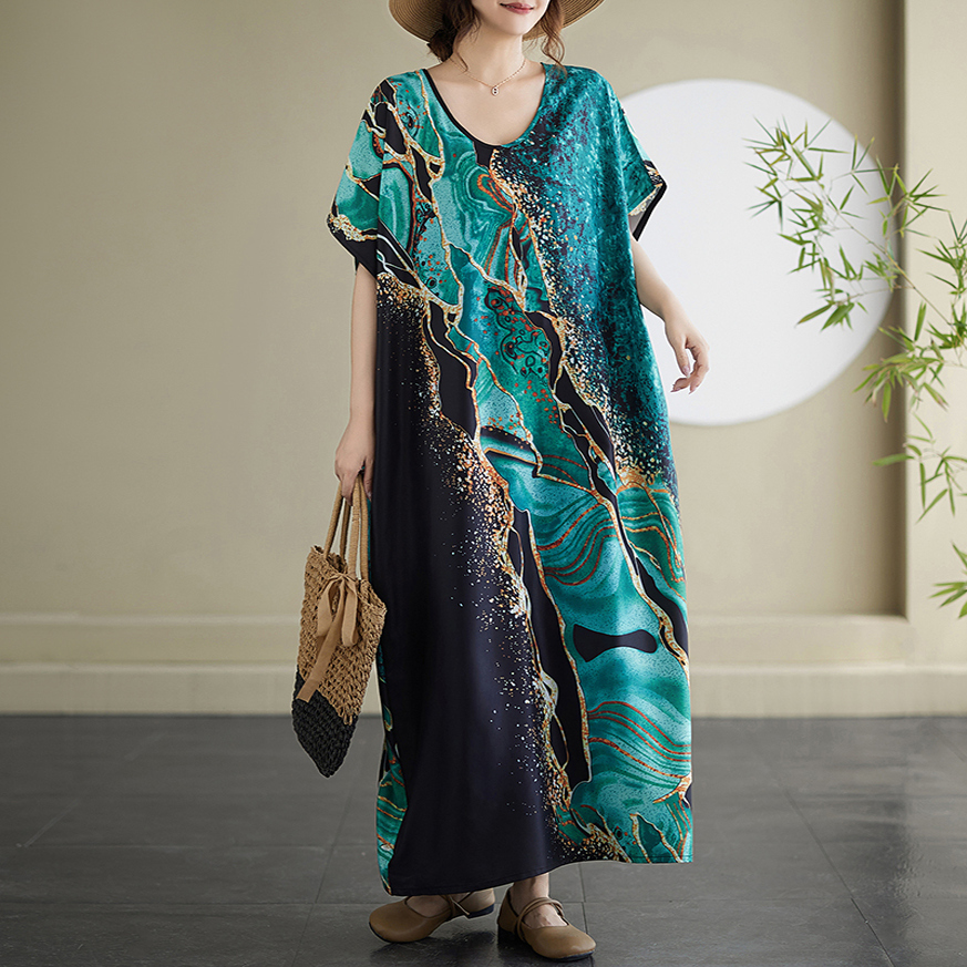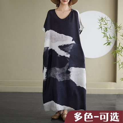 外贸跨境定位花 文艺印花休闲大长裙短袖长袍沙滩裙连衣裙子垂感