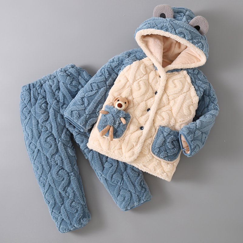 冬季男童睡衣珊瑚绒男孩法兰绒家居服女童加厚加绒儿童三层夹棉袄