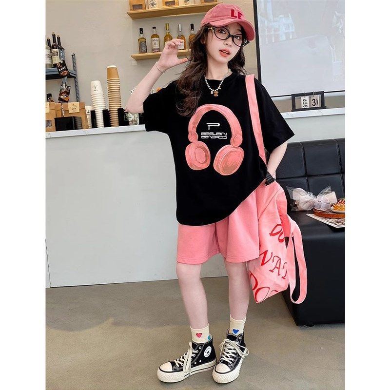 女童夏装短袖t恤上衣休闲短裤两件套2024新款中大童女孩套装衣服