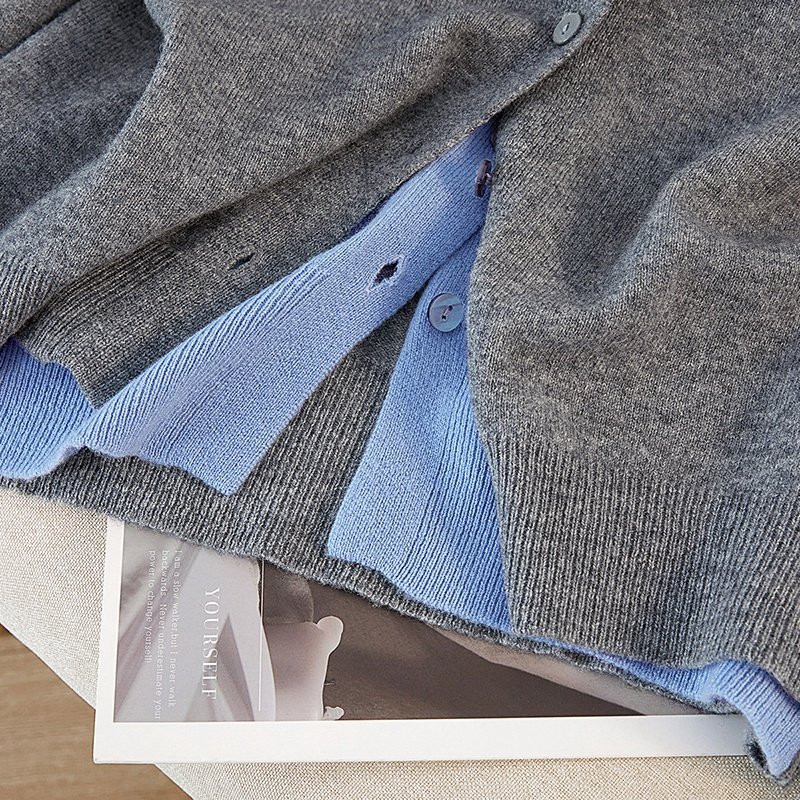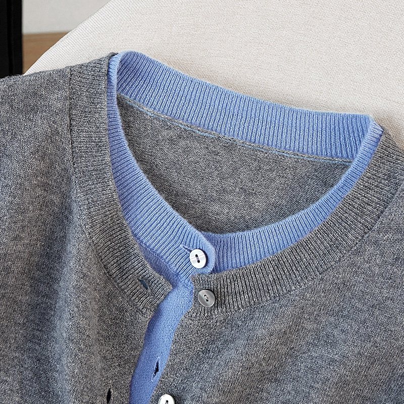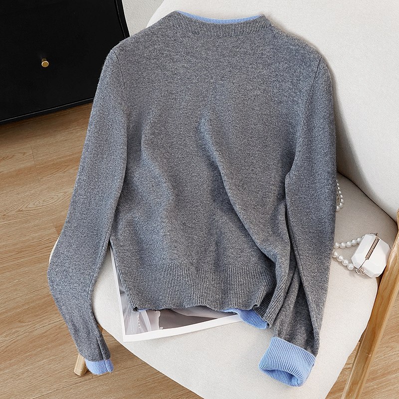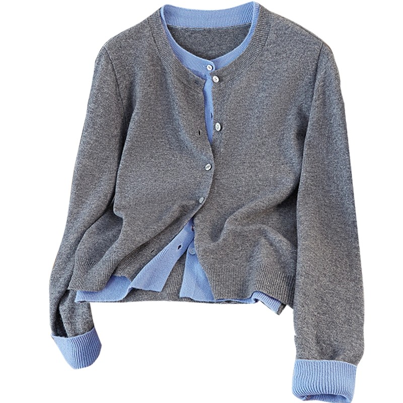 她池假两件针织衫2026春装新款女装简约圆领拼接撞色短款修身上衣