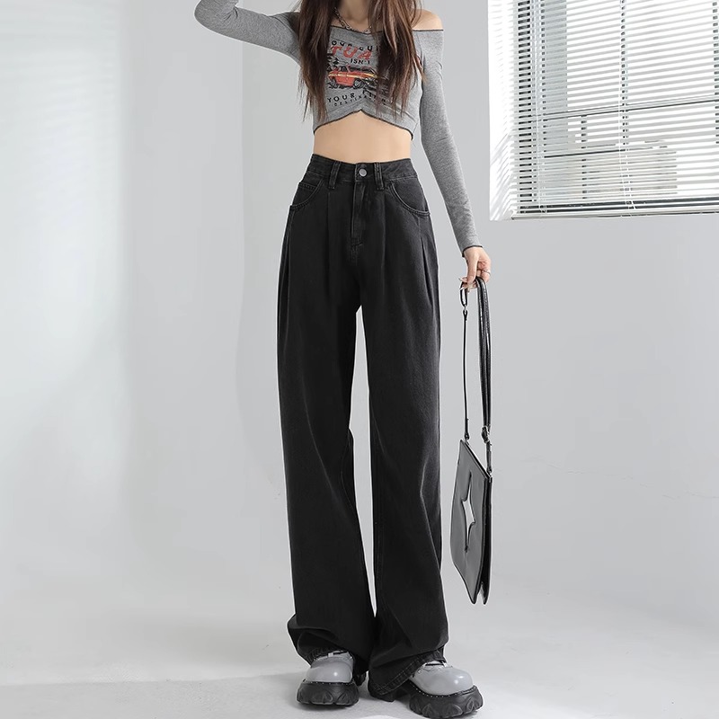 阔腿牛仔裤女褶皱高腰秋冬装黑灰色宽松显瘦新款直筒垂感拖地长裤