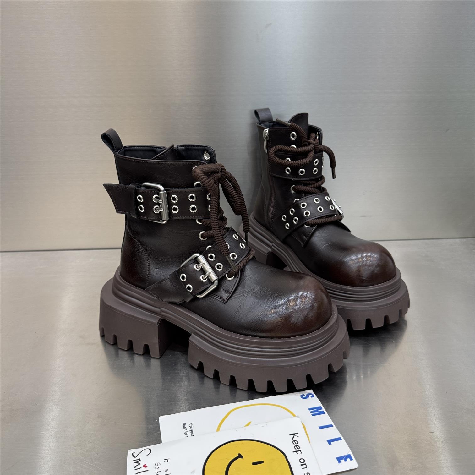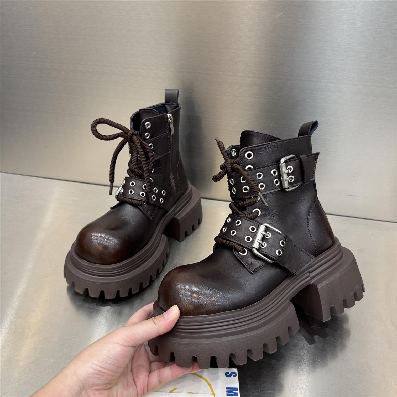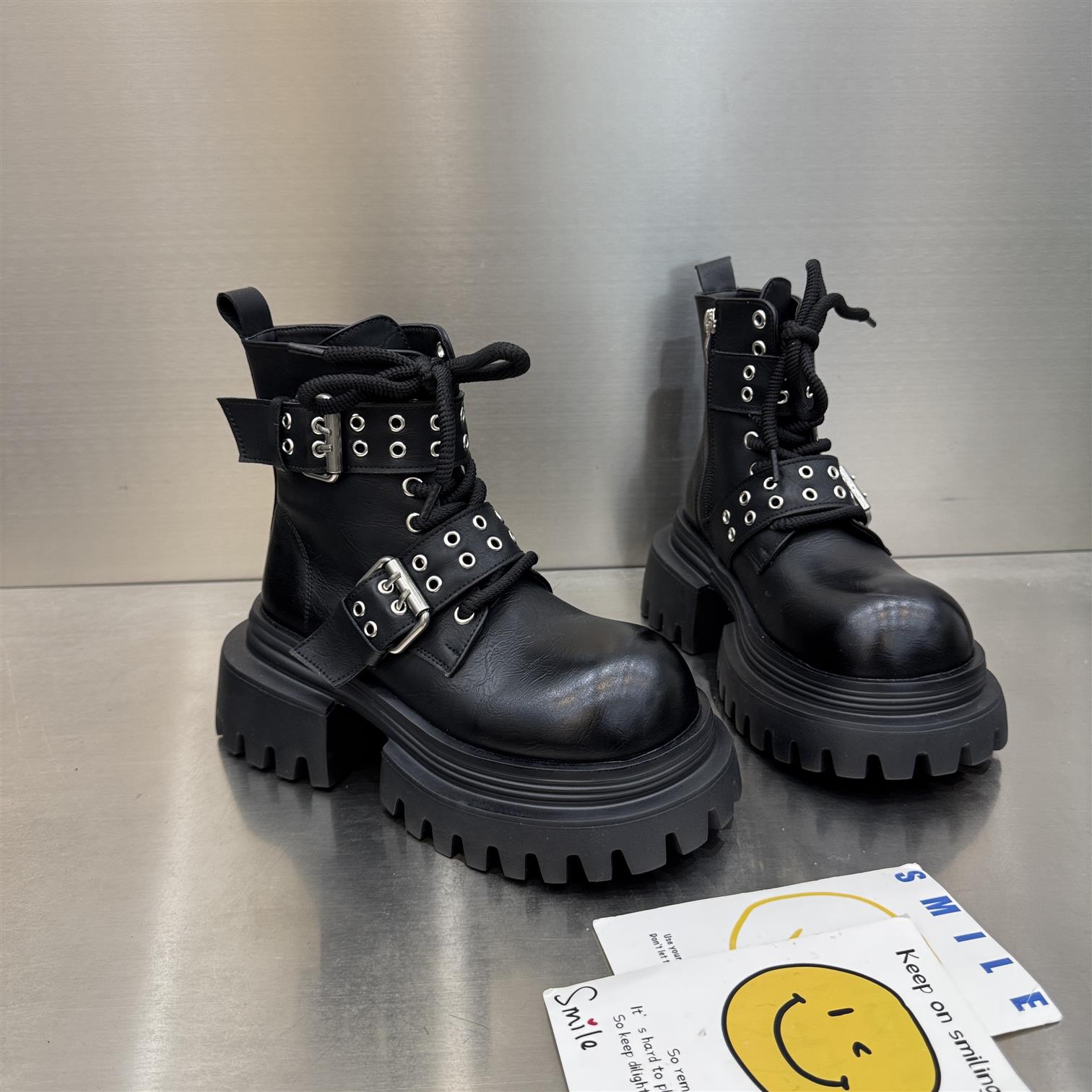 2025新款秋冬真皮超轻底6CM厚底松糕增高圆头皮带扣马丁靴女短靴