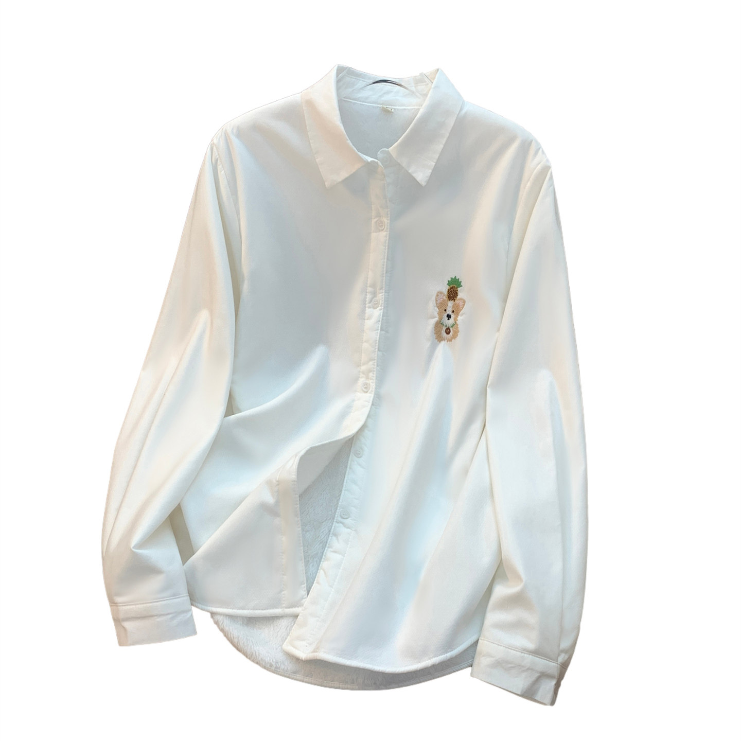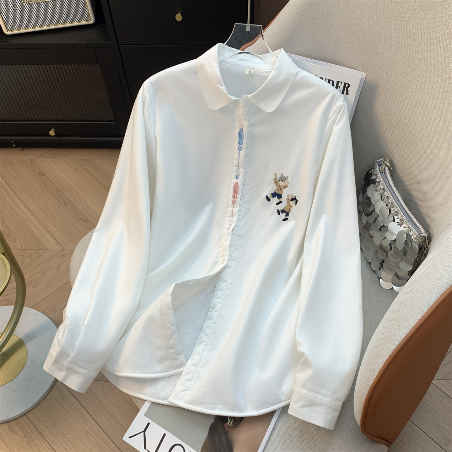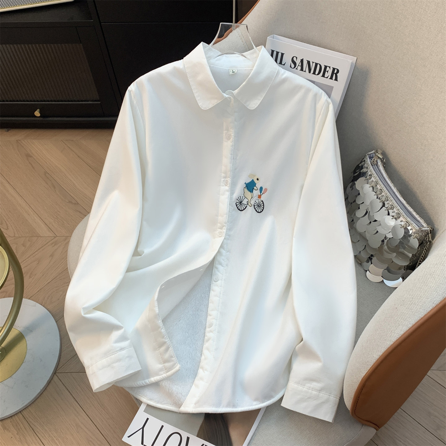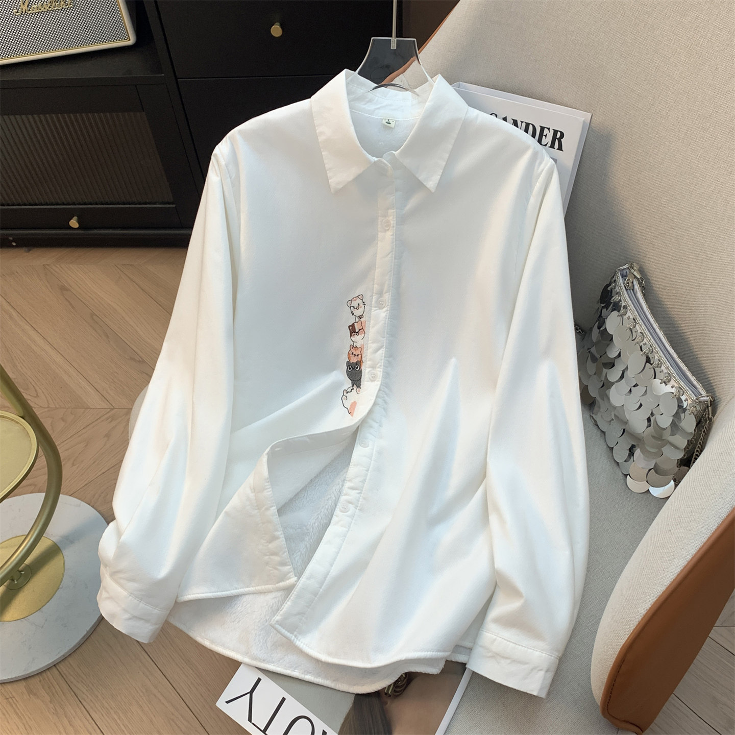 秋冬加绒加厚刺绣白衬衣女长袖时尚宽松显瘦保暖休闲打底衬衫上衣