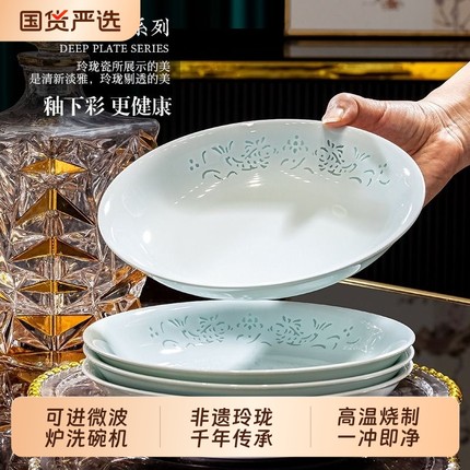 景德镇玲珑餐具釉下彩高温瓷家用碗碟组合套装深盘菜盘子易清洗