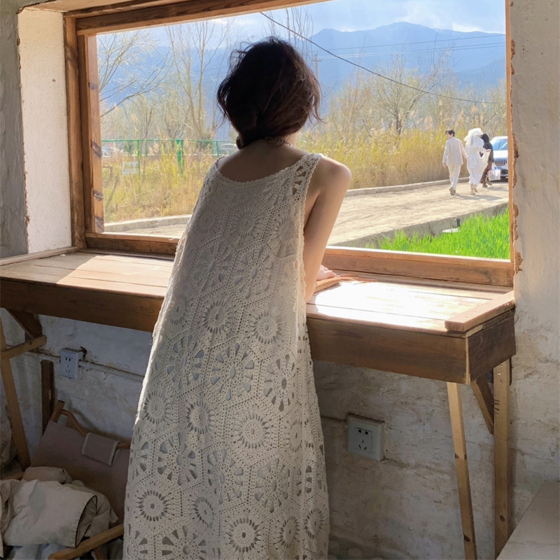 2024夏季新款复古风叠穿背心裙女宽松法式勾花镂空针织吊带连衣裙