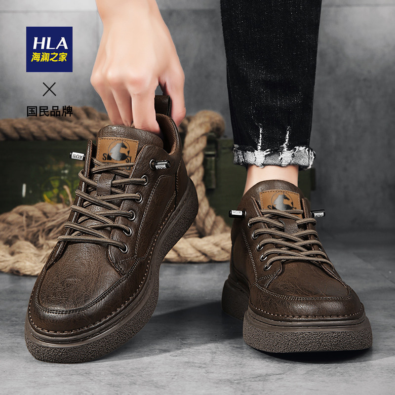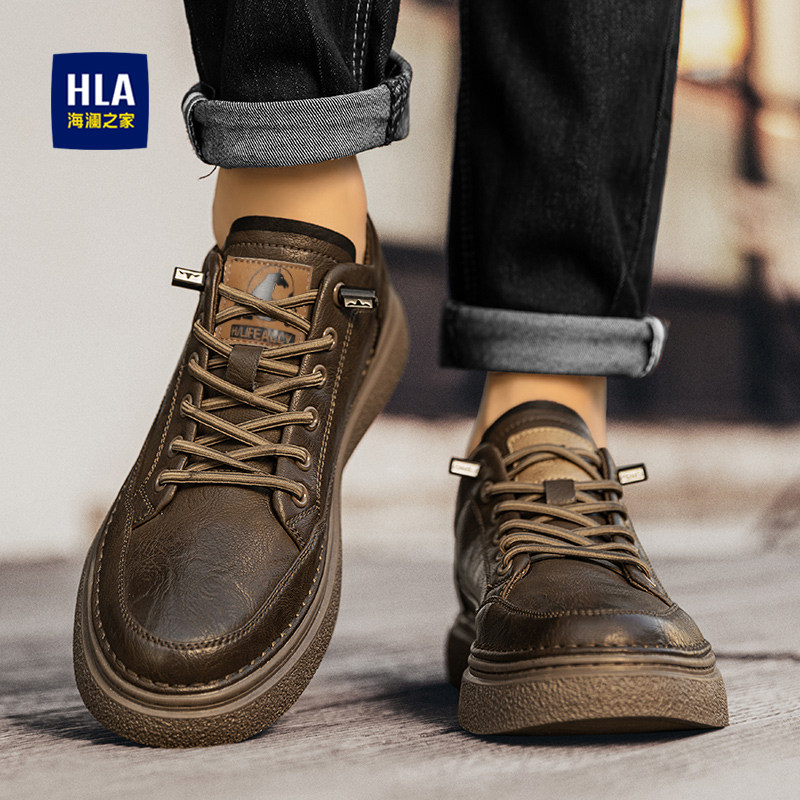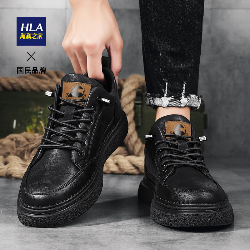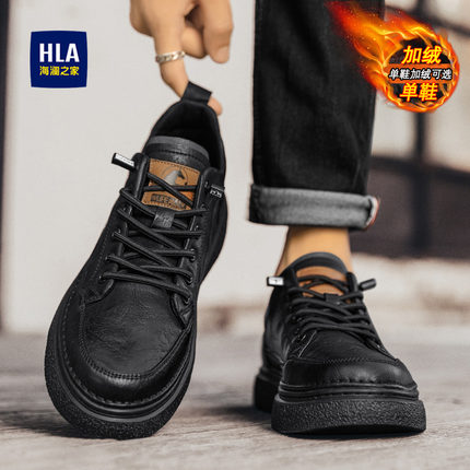 海澜之家男鞋春季真皮休闲皮鞋大码厚底加绒黑色英伦风板鞋一脚蹬