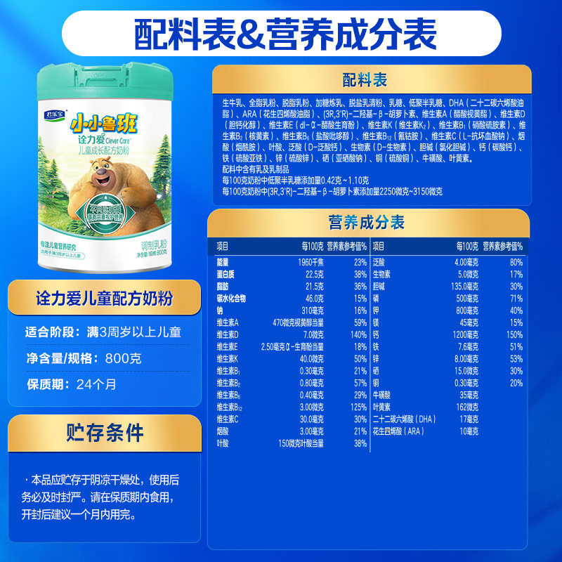 君乐宝小小鲁班诠力爱儿童牛奶粉4段玉米黄质 叶黄素800g*1罐