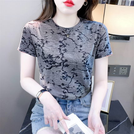 水墨印花纯棉短袖女士上衣服夏季新款T恤女装复古洋气宽松体恤衫