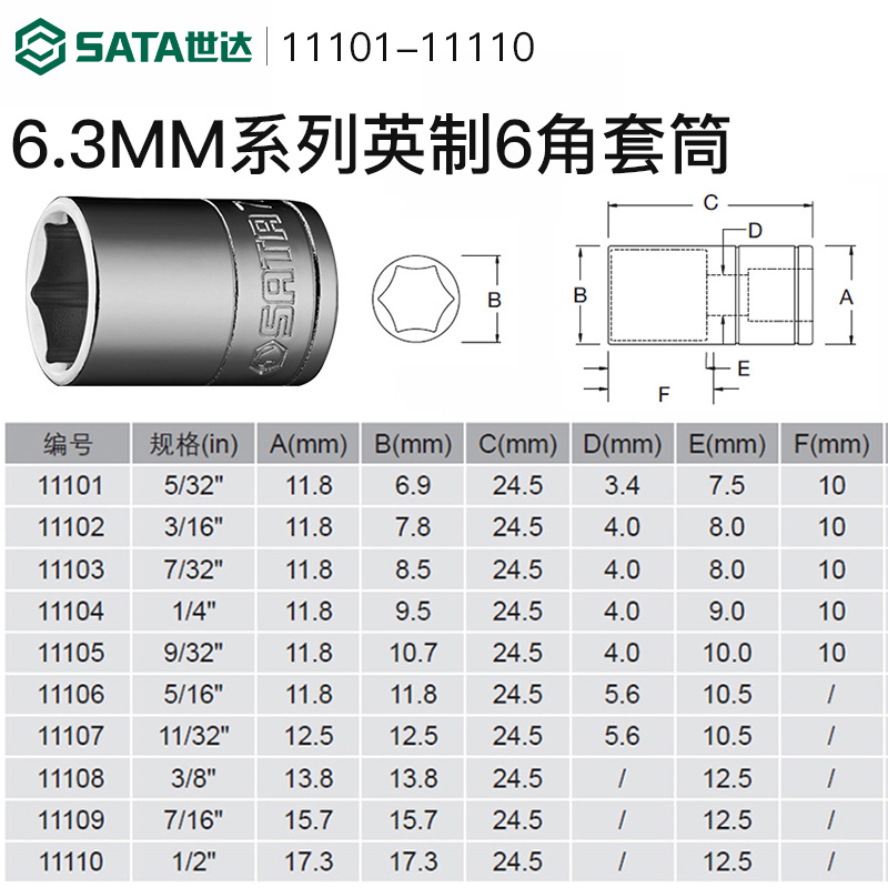 世达小飞英制套筒单个6.3mm外六角短6角套筒头快速棘轮扳手工具