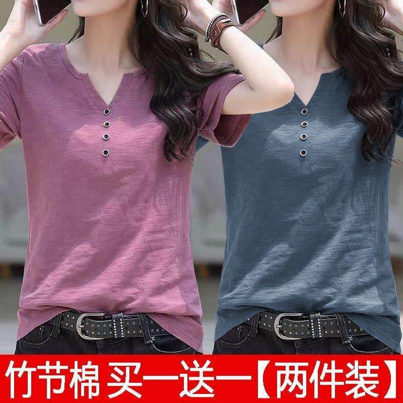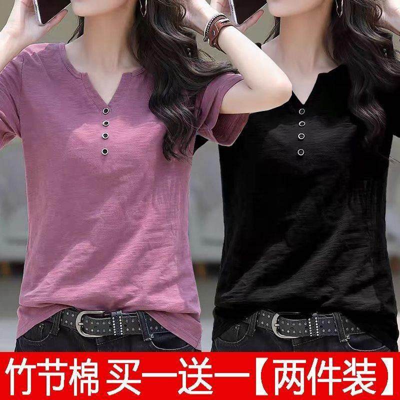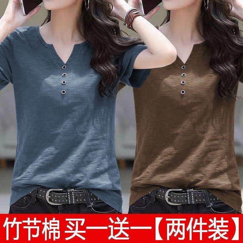 单/两件 竹节棉短袖t恤女夏季打底小衫宽松显瘦v领纽扣百搭上衣