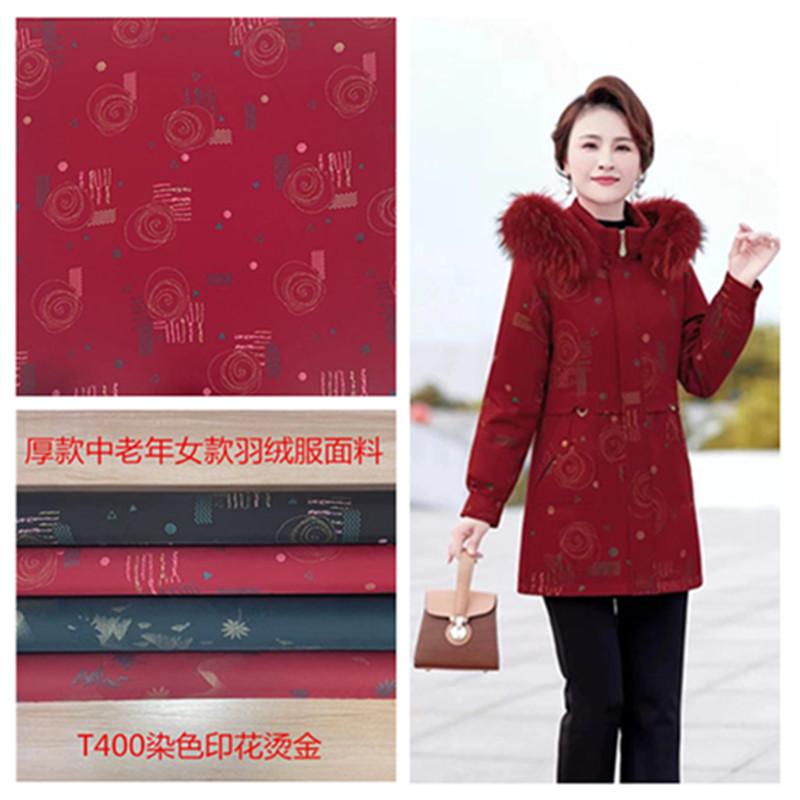 高档羽绒服面料T400染色印花烫金加厚定制中老年女款棉服专用布料