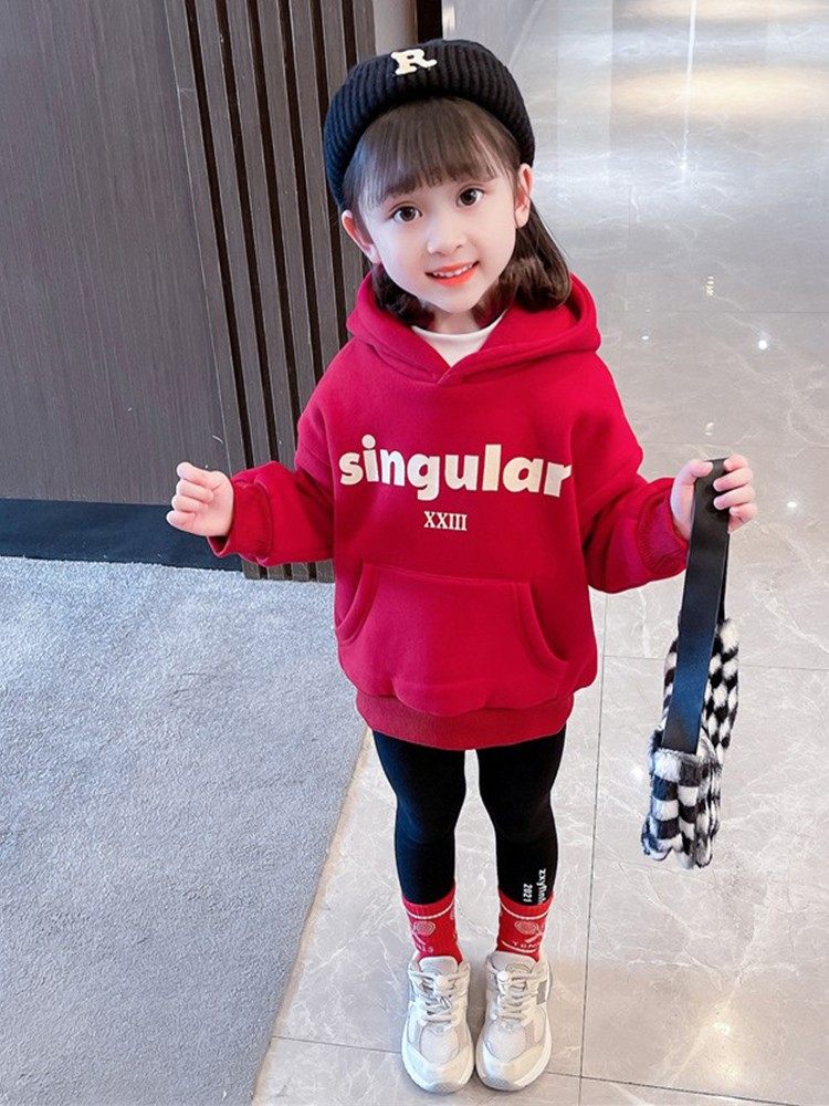 女童卫衣秋冬2025新款儿童炸街加绒红色连帽上衣洋气宝宝加厚外套