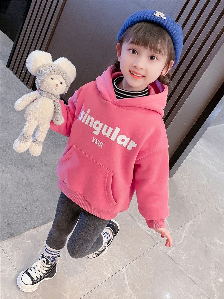 女童卫衣秋冬加绒红色连帽上衣