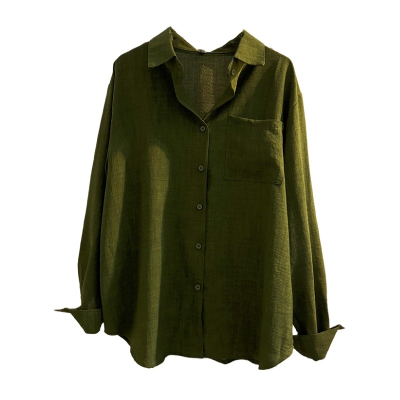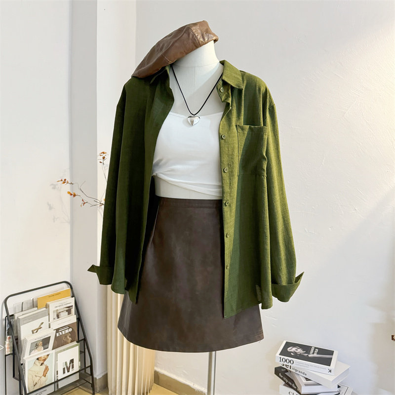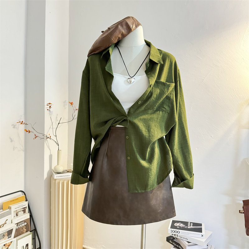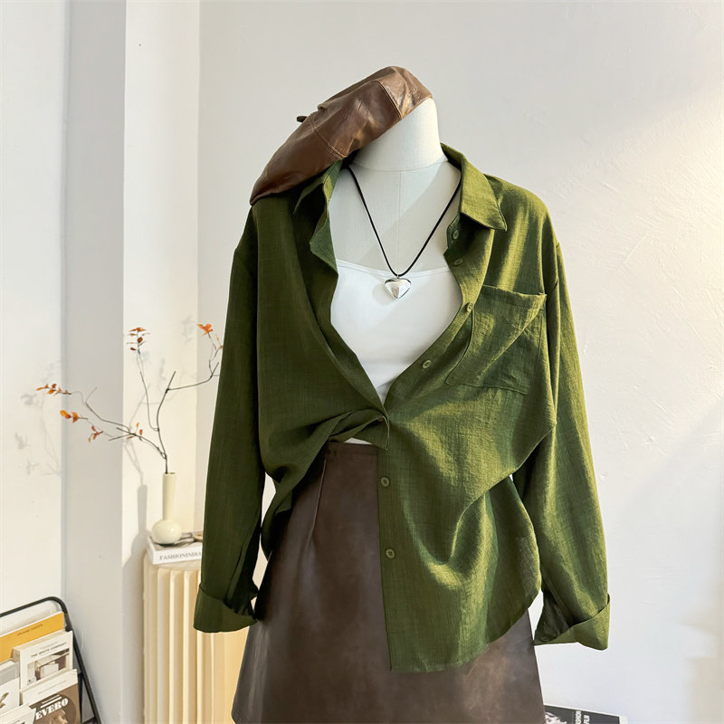 复古绿色长袖衬衫女2025春秋设计感宽松休闲港风内搭打底叠穿衬衣