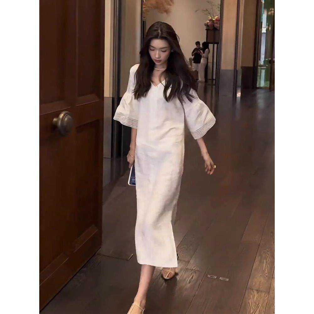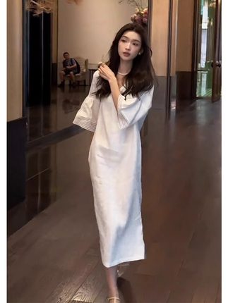 小个子超好看白色棉麻亚麻连衣裙小众设计遮肚子宽松显瘦法式长裙