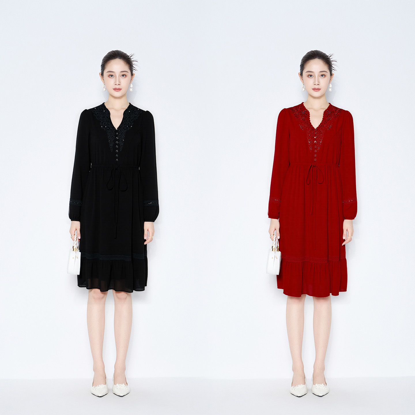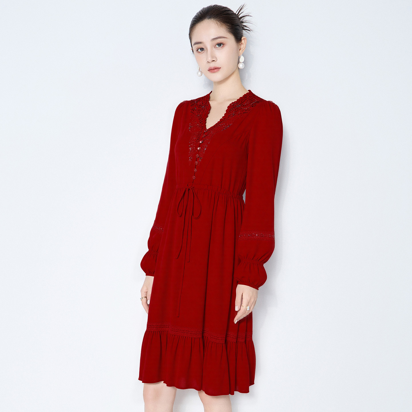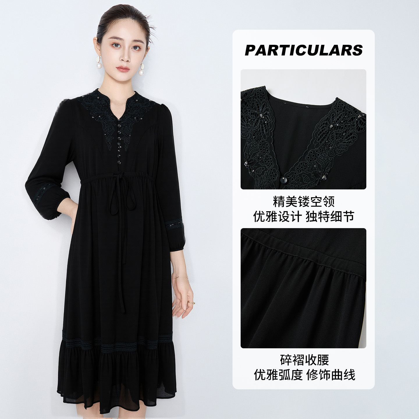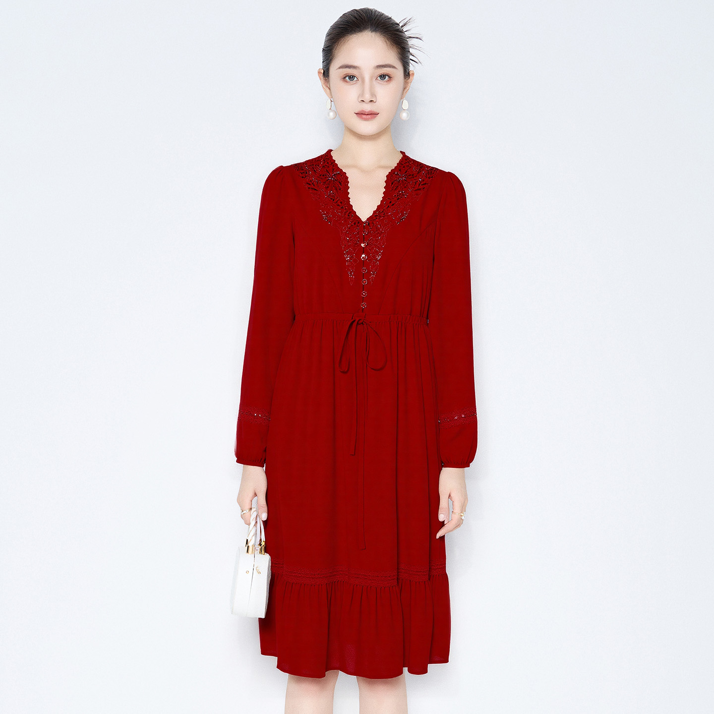 马天奴2025秋冬新款法式系带收腰气质连衣裙子镂空绣花文艺时尚女