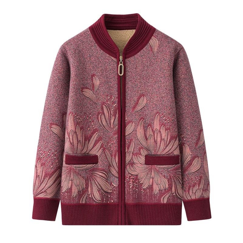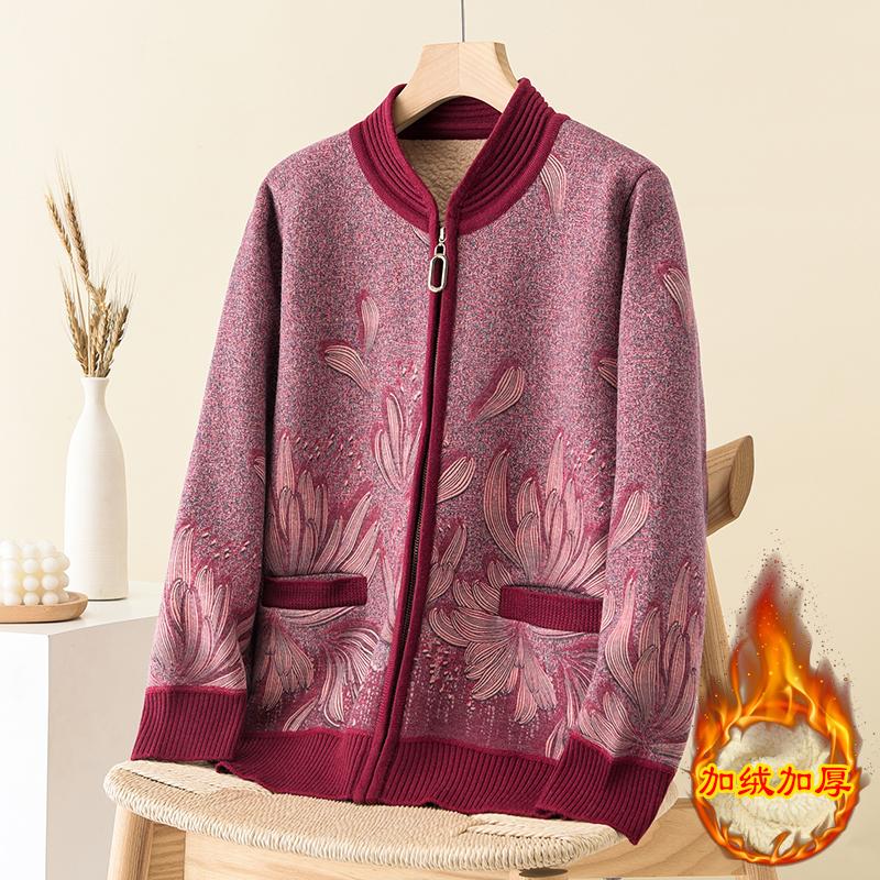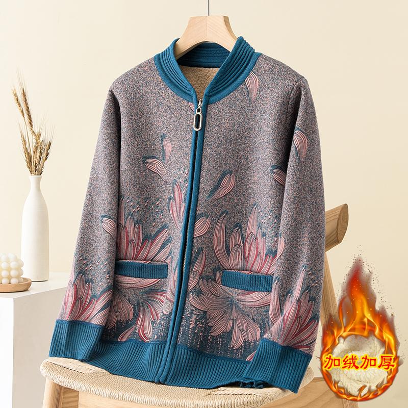 奶奶秋冬装加绒针织外套中老年人拉链开衫保暖上衣老太太加厚套装