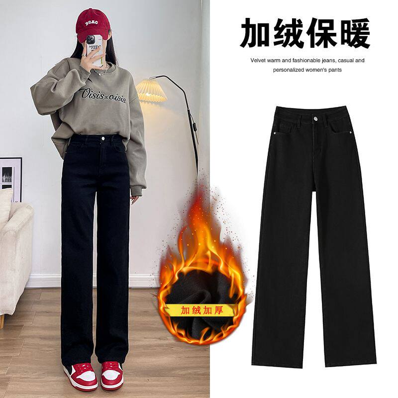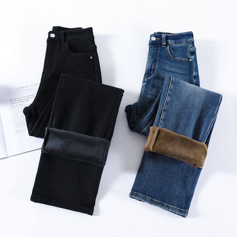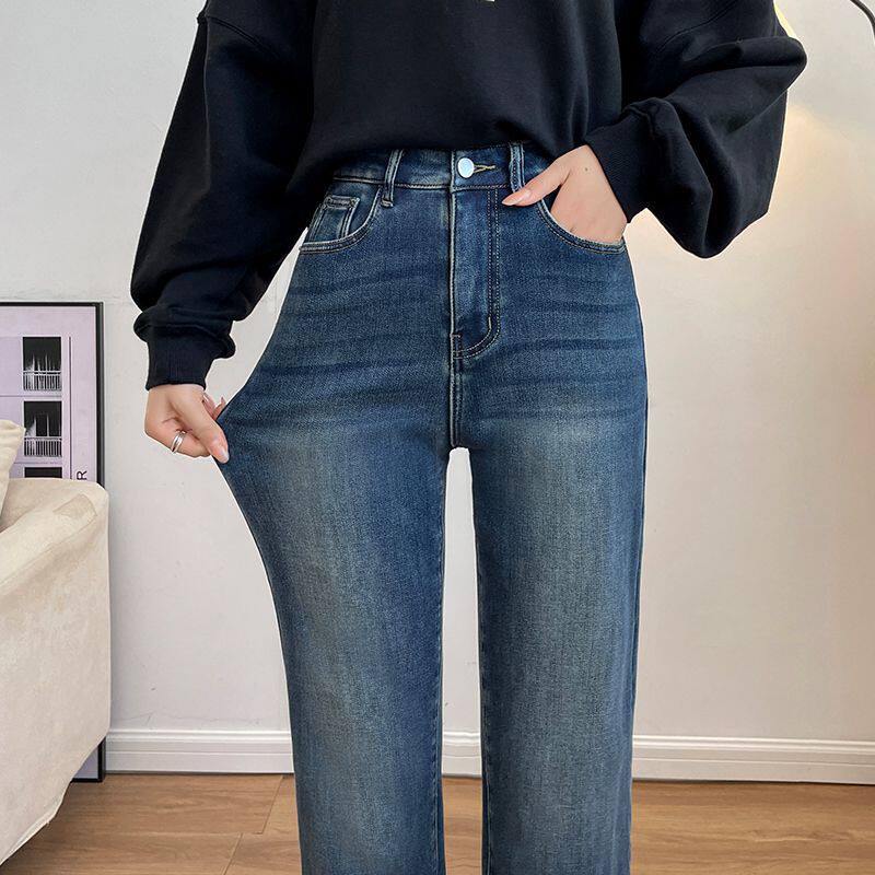 小个子9分裤女薄绒加厚直筒2025年秋冬季窄版显瘦加绒九分牛仔裤