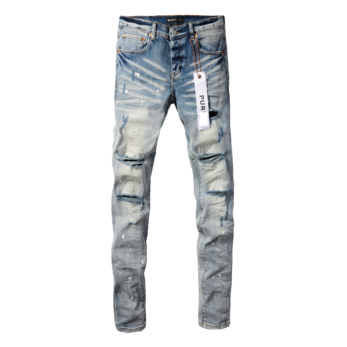 PUR秋季新款潮牌浅色泼墨涂鸦刮烂破洞牛仔裤男弹力修身小脚裤子
