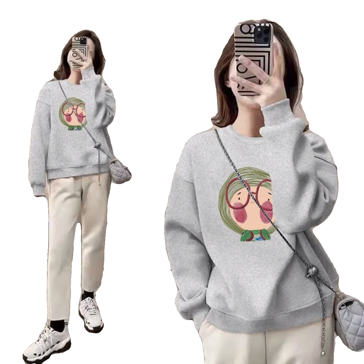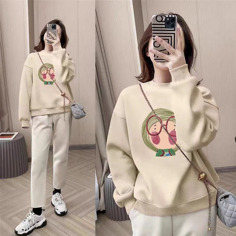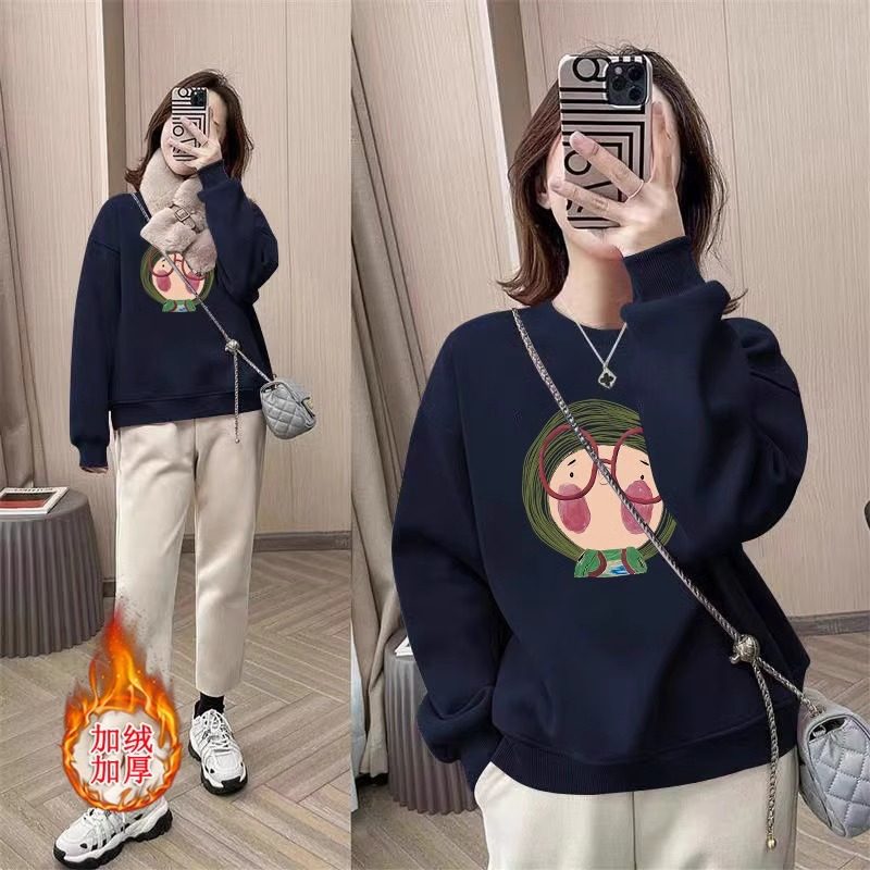 加绒加厚圆领纯棉卫衣女2025秋冬宽松大眼镜卡通印花圆领保暖上衣