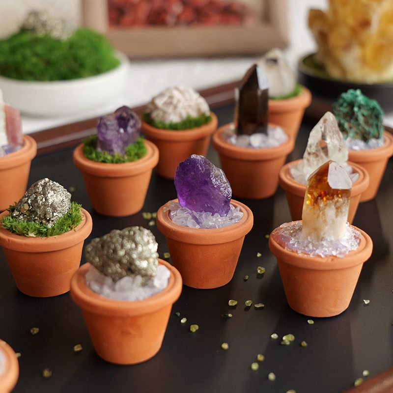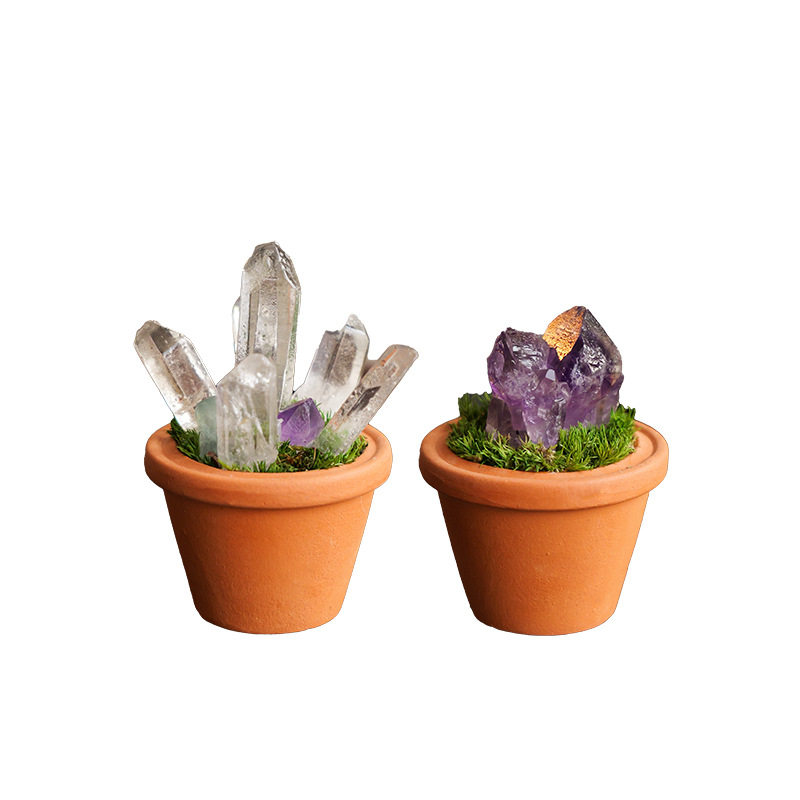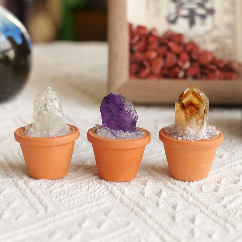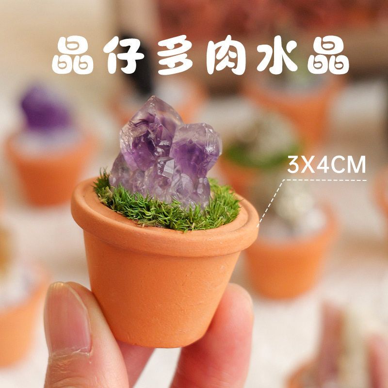 水晶原石盆栽车载摆件创意天然水晶宝石矿标桌面微景观陶盆工艺品