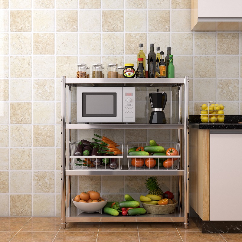 不锈钢家用多层厨房置物架四层落地微波炉收纳架V厨房架子4层架