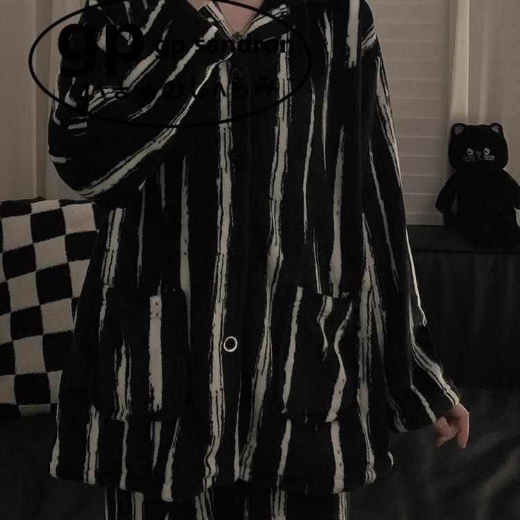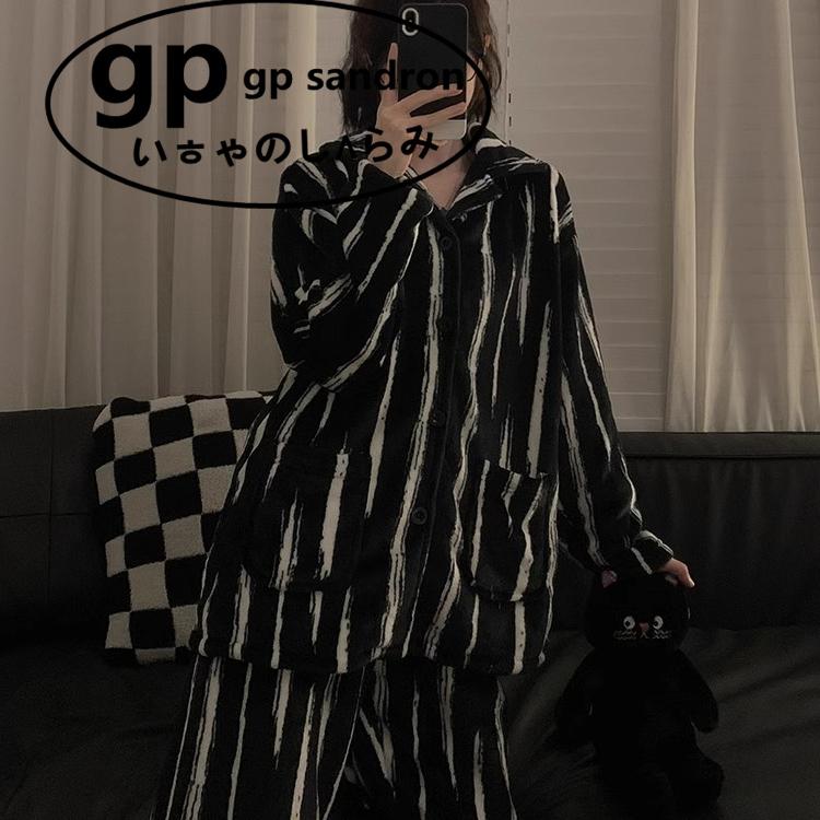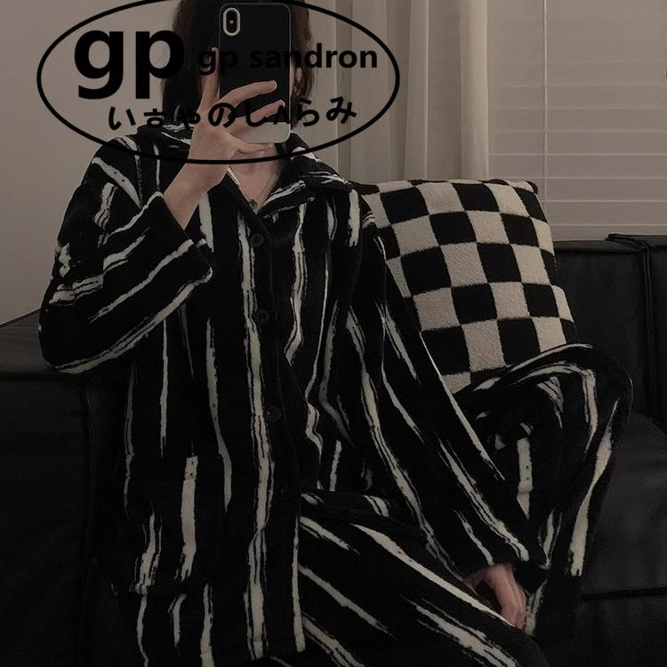 日本小众GP条纹冬季珊瑚绒睡衣女加厚保暖宽松男士情侣家居服套装