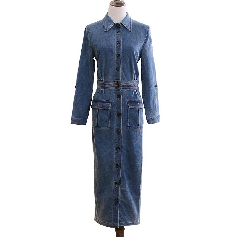 韩版春秋大码显瘦牛仔连衣裙长袖复古收腰包臀气质中长裙一步裙女