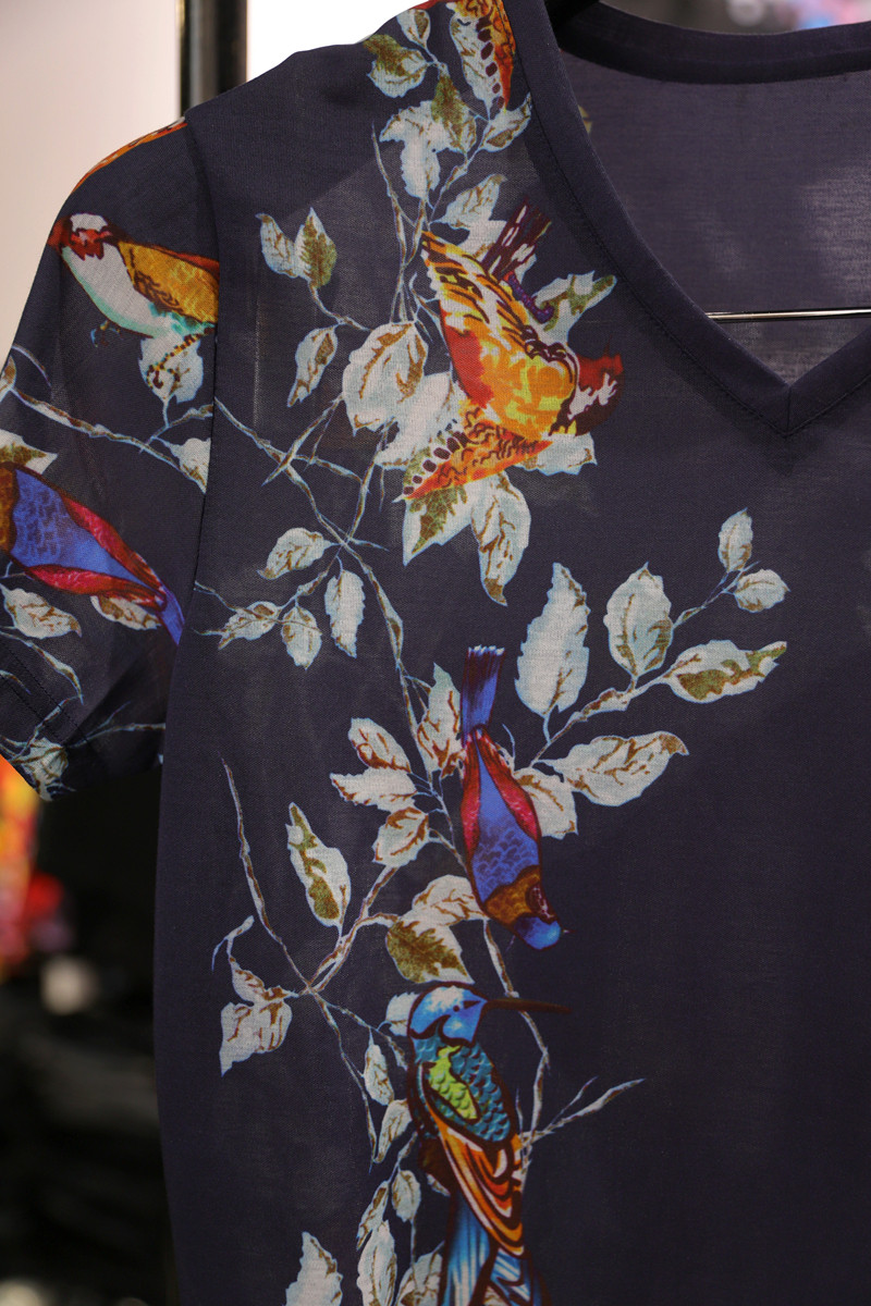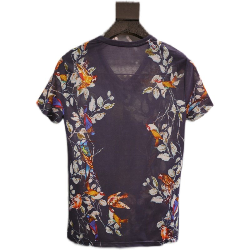米兰站欧台秀款优质双丝光棉数码植物花卉印修身V领时尚短袖T恤男
