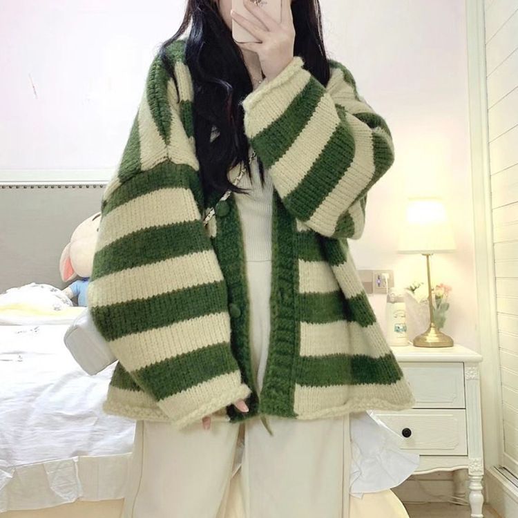 春秋学院风甜美条纹V领开衫针织毛衣女学生韩版宽松显瘦上衣外套