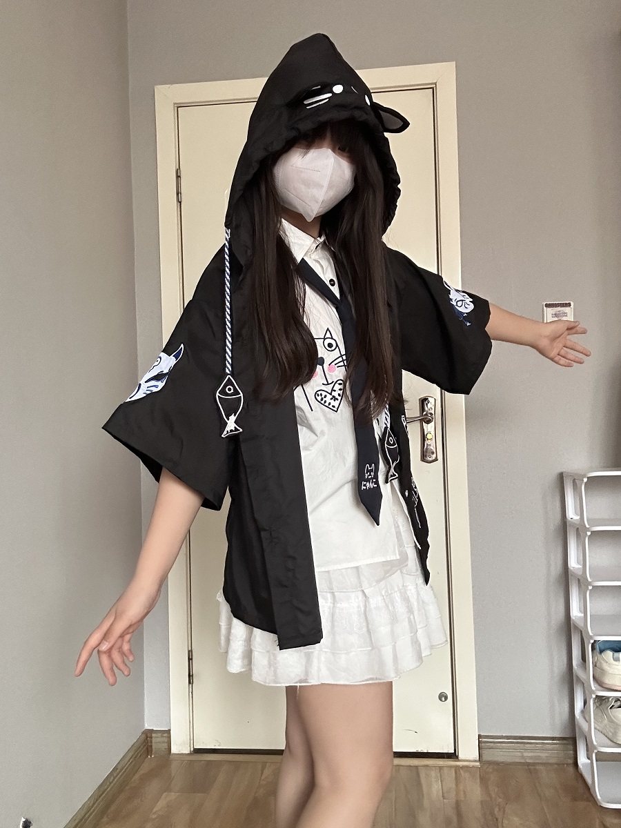 可爱小清新软妹轻古风改良薄外套狐狸猫咪印花宽松连帽学生防晒衣