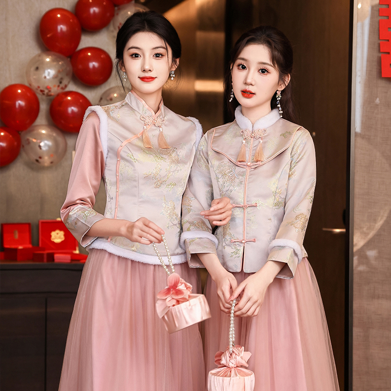 中式伴娘服女2025新款姐妹团礼服复古国风旗袍长袖加厚保暖伴娘裙
