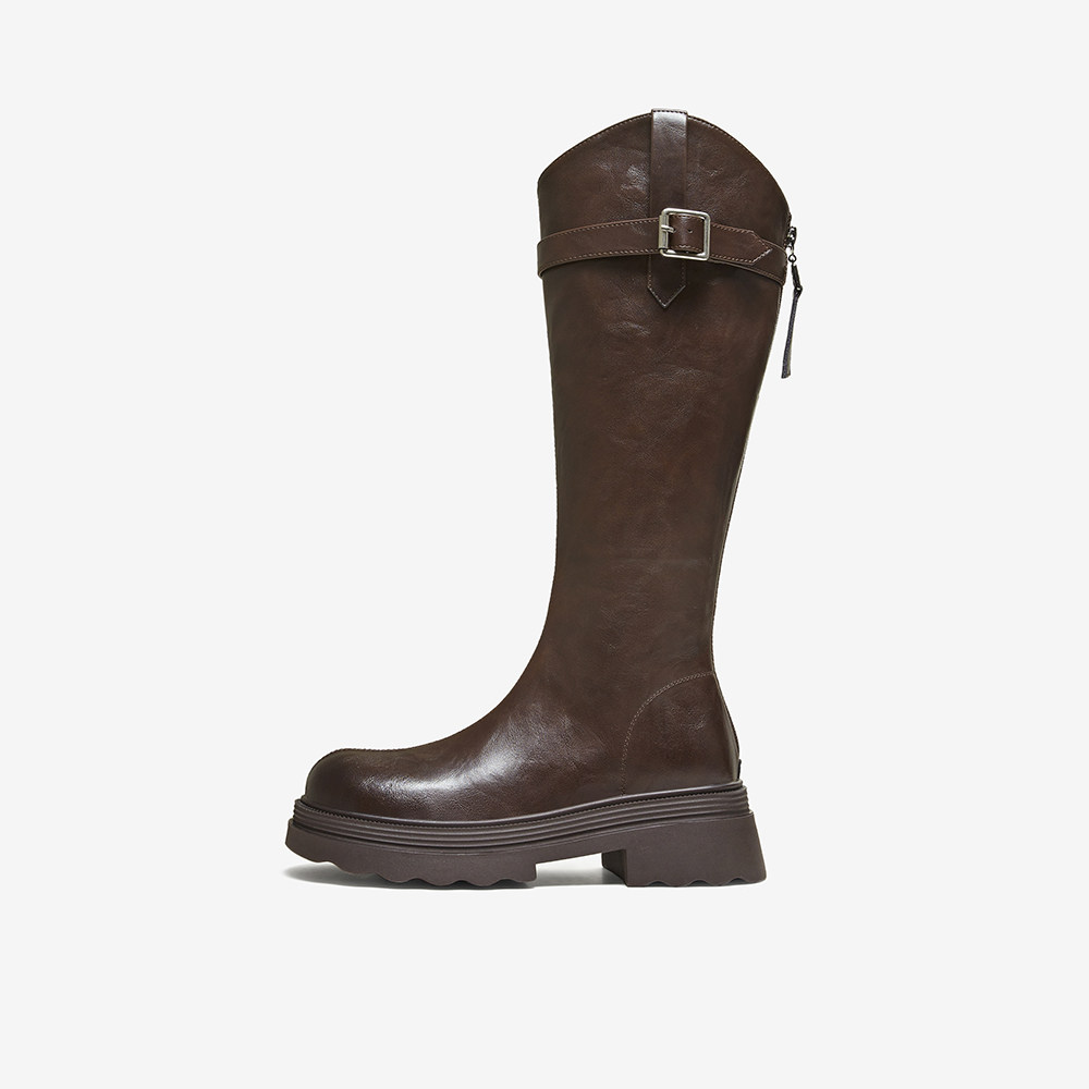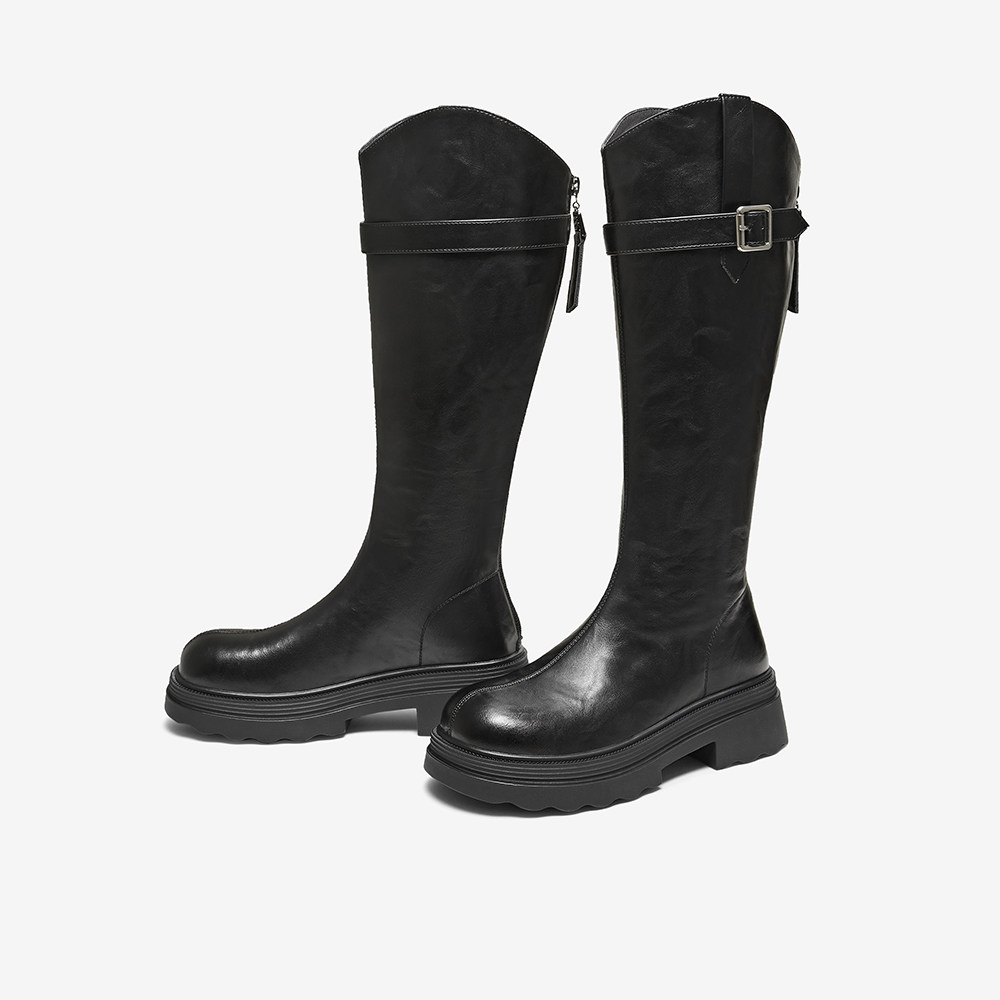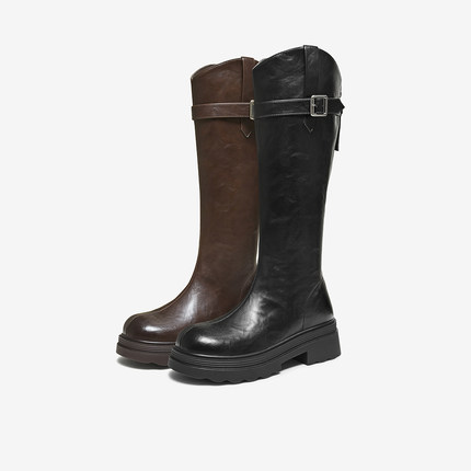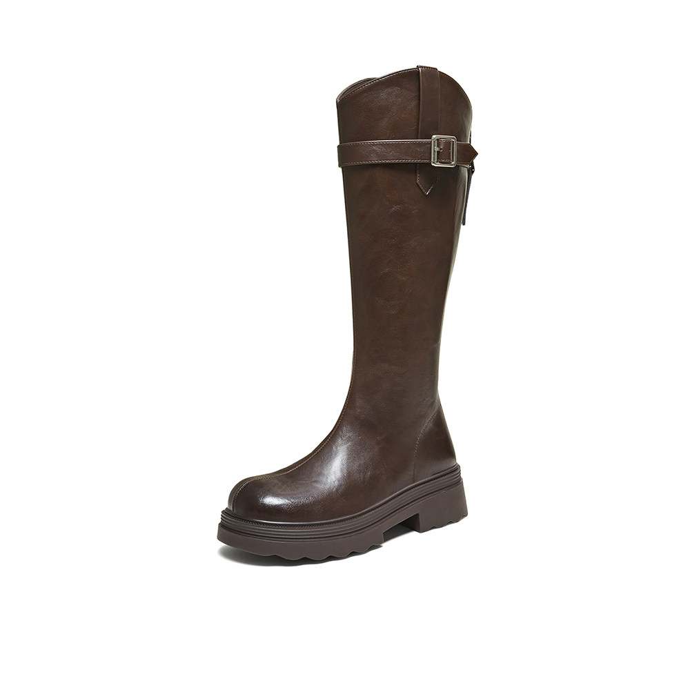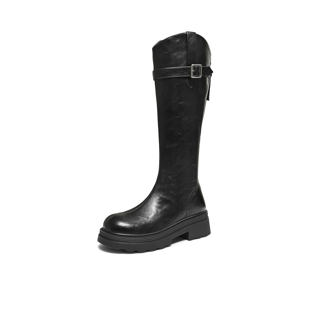 百思图2025冬季新款粗跟骑士靴女V口大筒围长靴BV808DG5