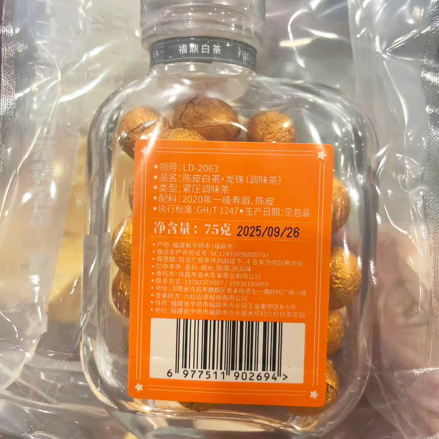 胖东来代购 陈皮白茶龙珠75g正宗福鼎白茶独立包装紧压调味茶送礼