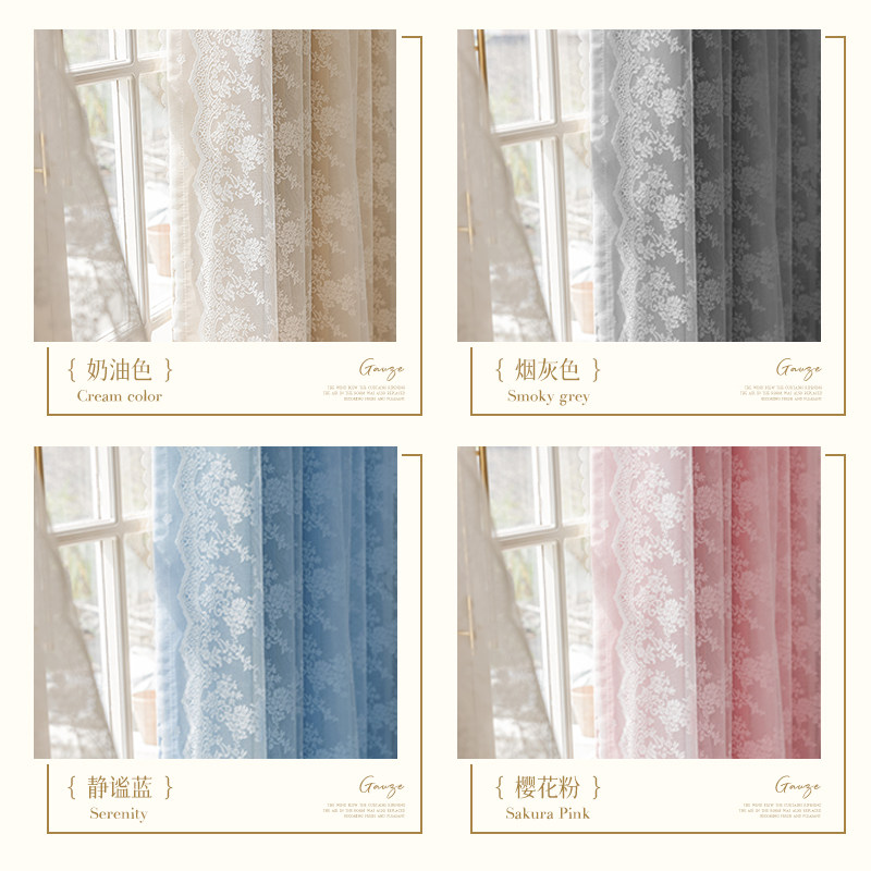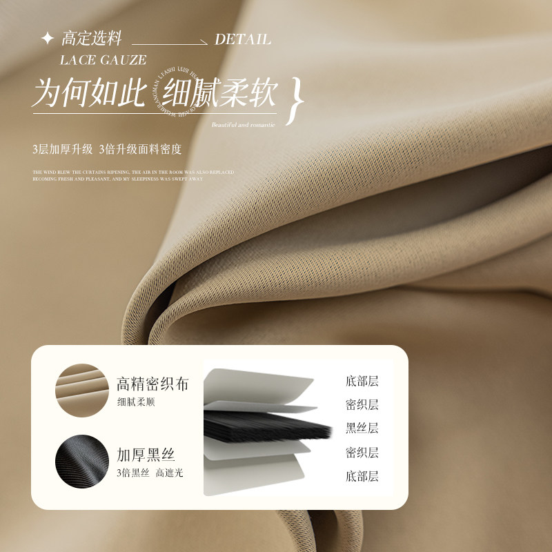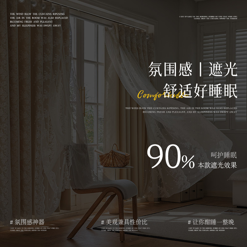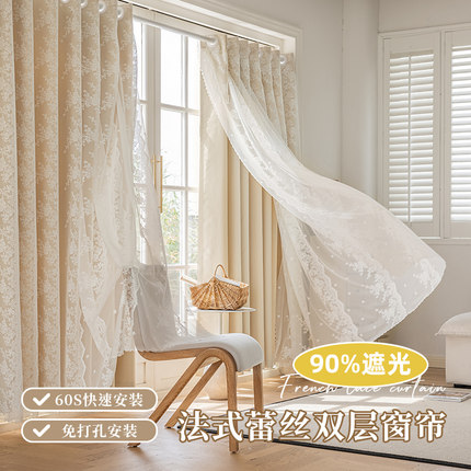 法式遮光窗帘蕾丝双层布纱一体免打孔安装2023年新款卧室阳台飘窗