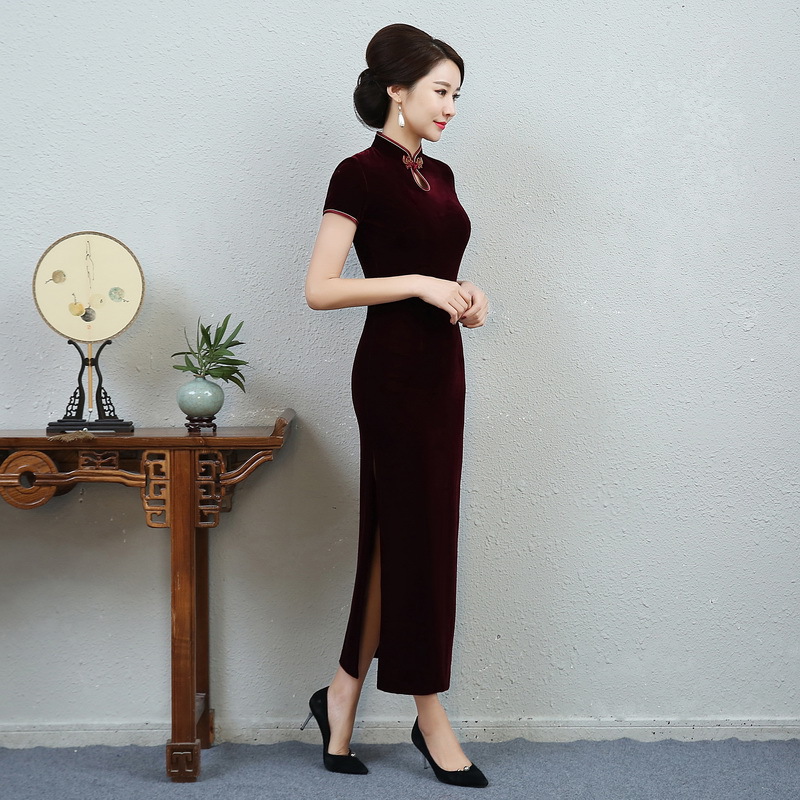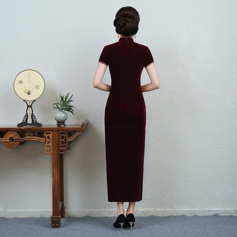 秋季长款七分袖鸿韵绣丝绒旗袍改良复古修身酒红敬酒连衣裙大码女