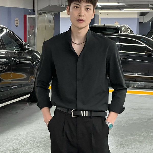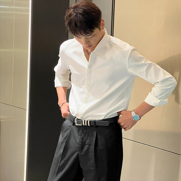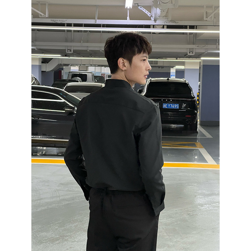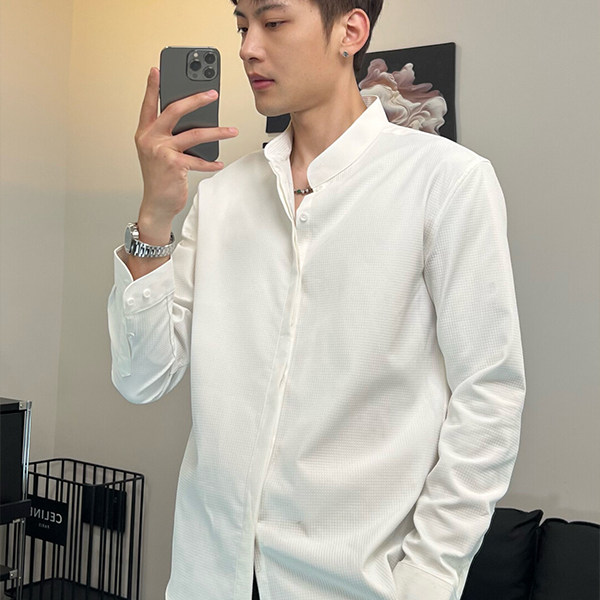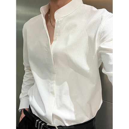 新中式立领衬衫男高级感痞帅修身长袖暗扣中山装衬衣白色华夫格潮
